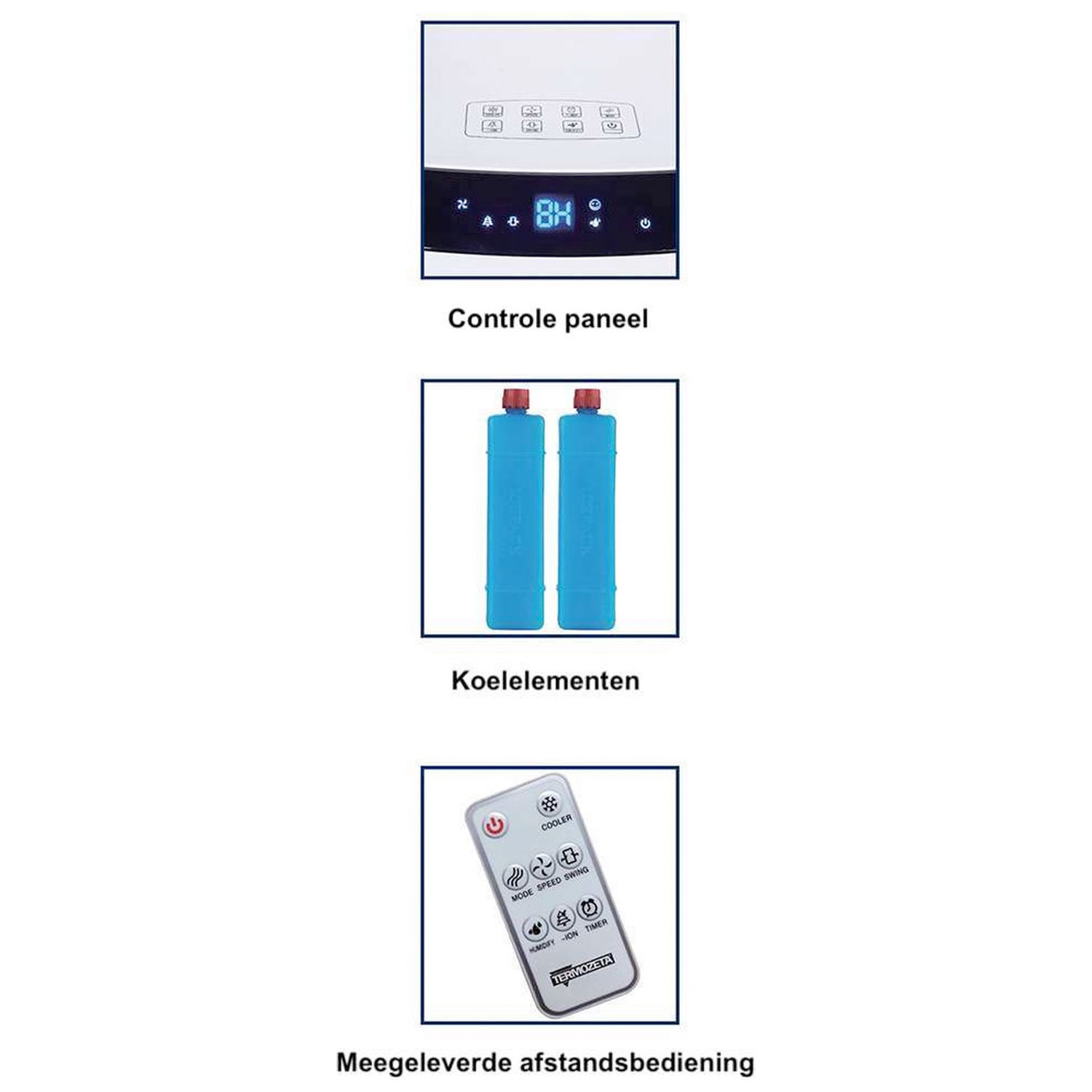 Verdampingsluchtkoeler met grote 10ltr tank, luchtbevochtiger functie, elektronische bedieningselementen en afstandsbediening; verstelbare voorvleugels, 7 uurs timer, akoestisch water eindsignaal; ionisator.