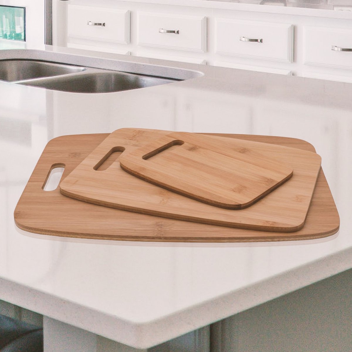 Prachtige set van 3 bamboe snijplanken in handige houder. Kiezen voor bamboe is kiezen voor natuur! Deze snijplank hout komt in drie verschillende formaten. Bamboe is een onuitputtelijke natuurlijke plant waarvoor dus geen bomen hoeven te worden gehakt. Bovendien is de snijplankenset harder en dichter van structuur dan de meeste tropische hardhoutsoorten. Bamboe beschadigt je mes niet, neemt bijna geen vocht op en breekt zeer snel bacteriën af. Hét ideale materiaal dus voor een snijplank in de keuken!
