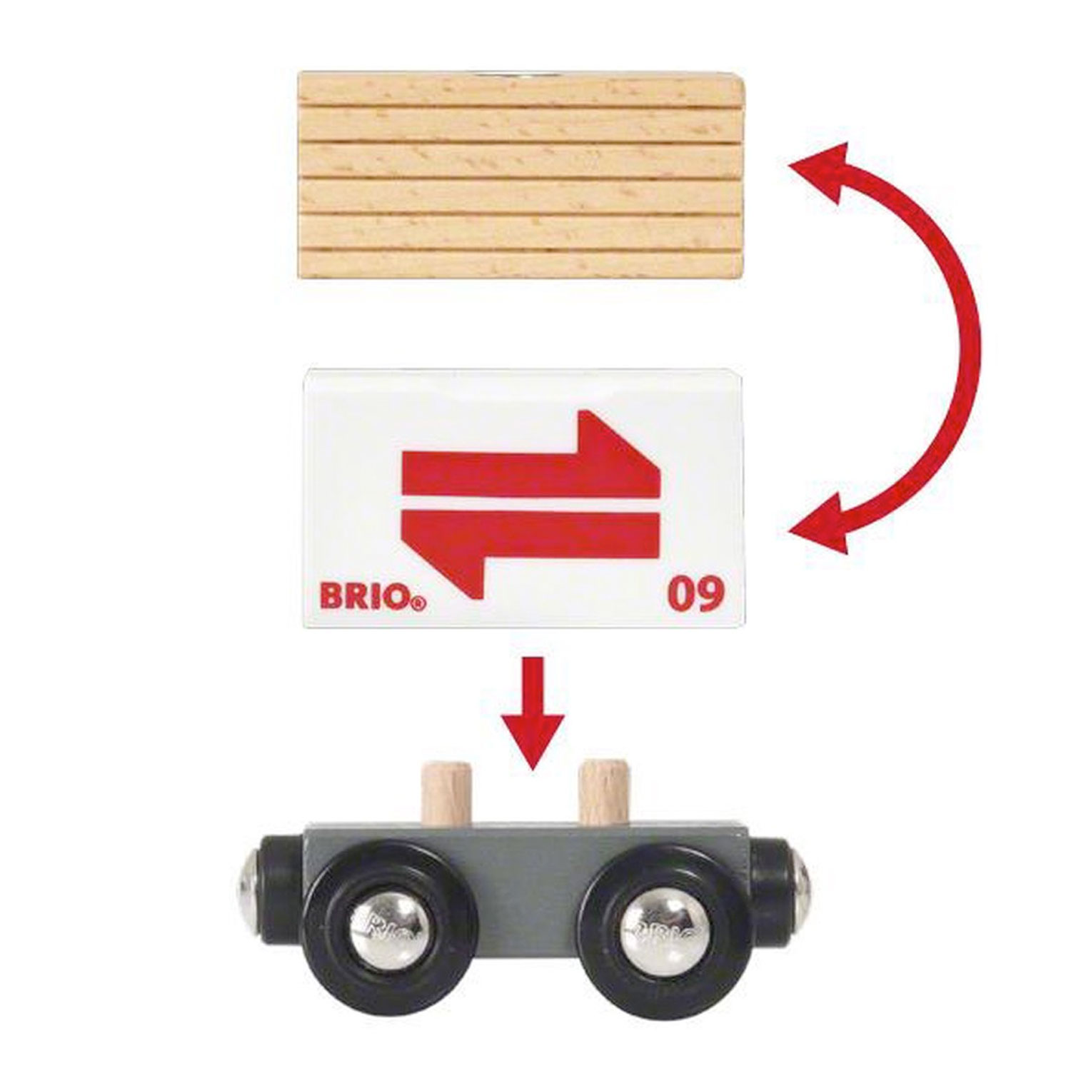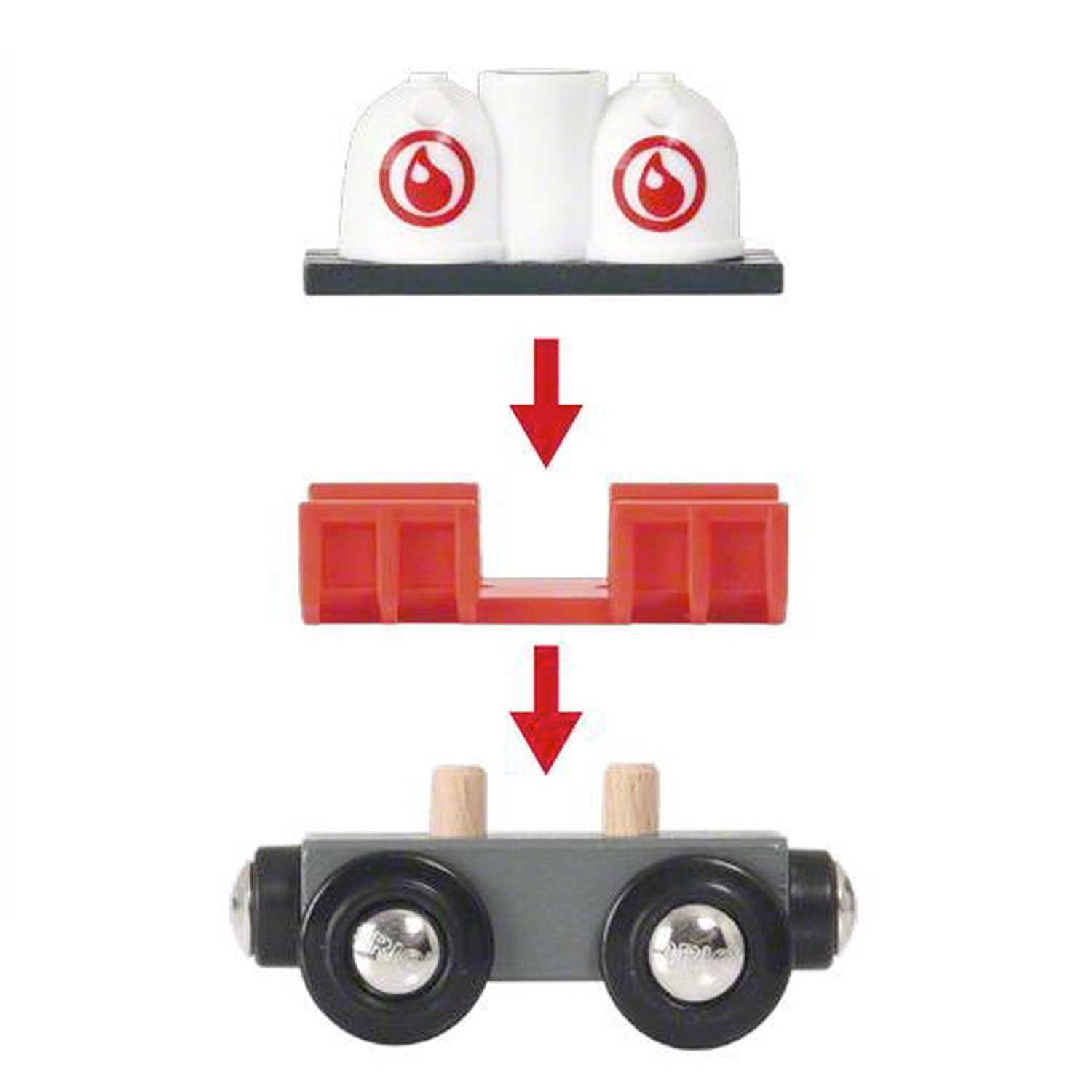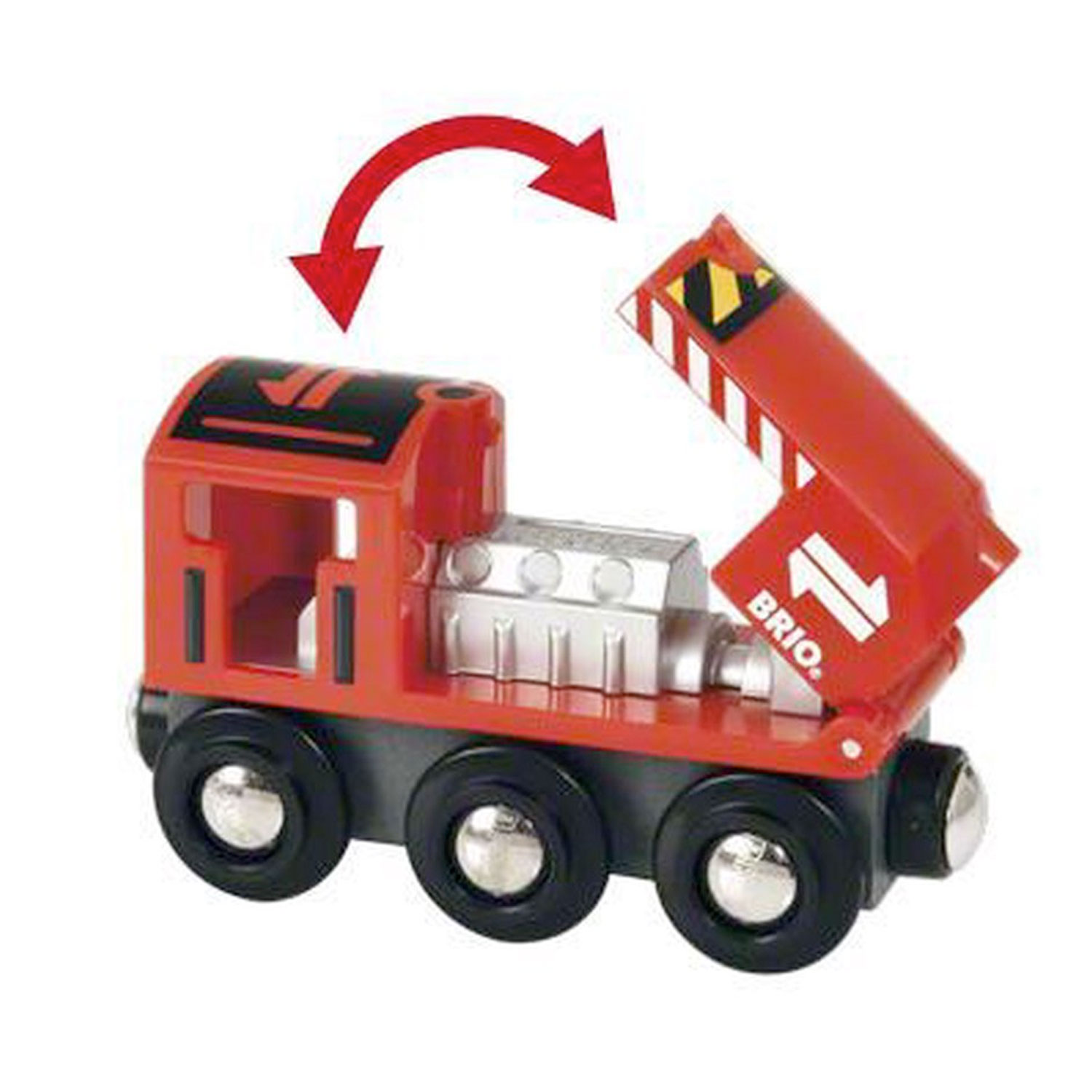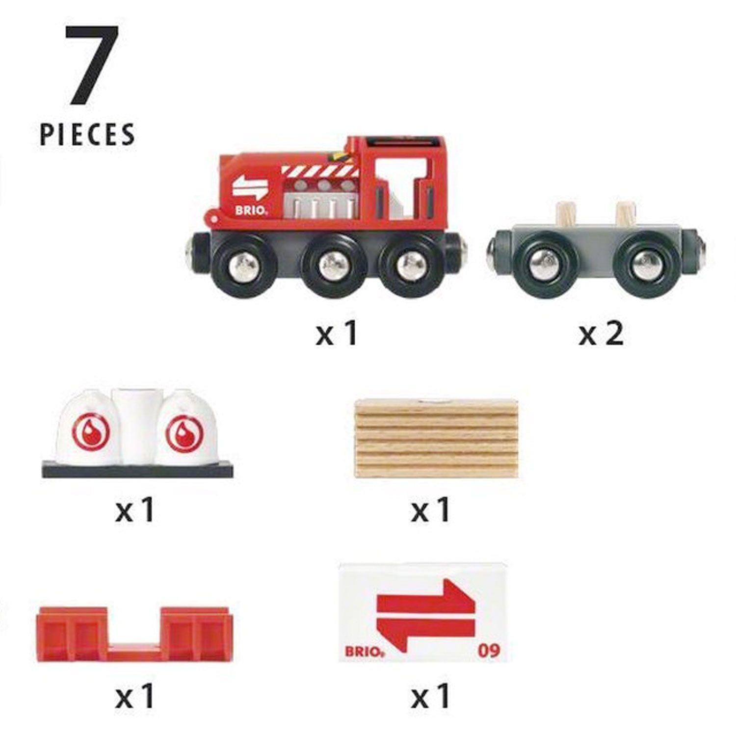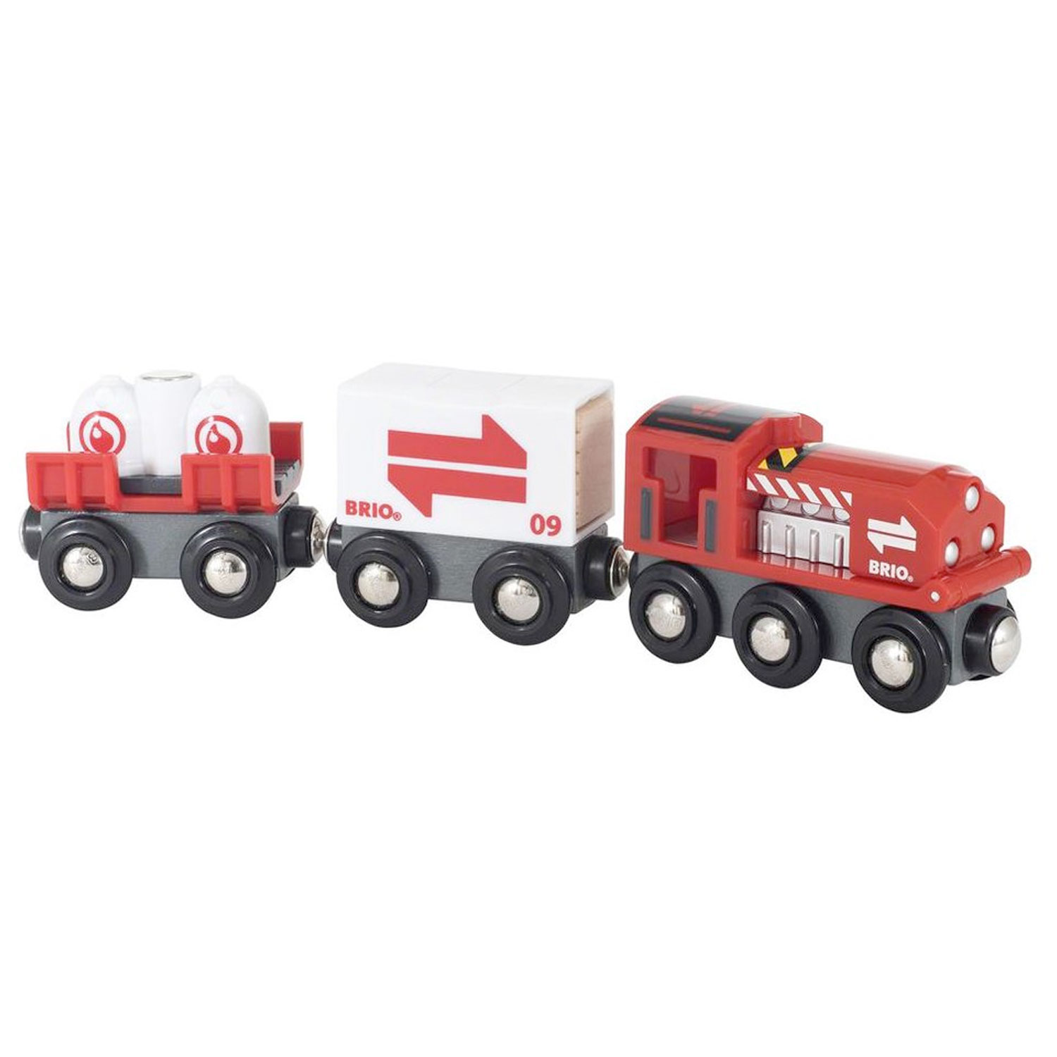 Deze speelgoed goederentrein heeft een motorkap die open kan en twee wagons – een met een lading hout, en een met een tank. Deze goederentrein sluit perfect aan bij alle BRIO world producten.