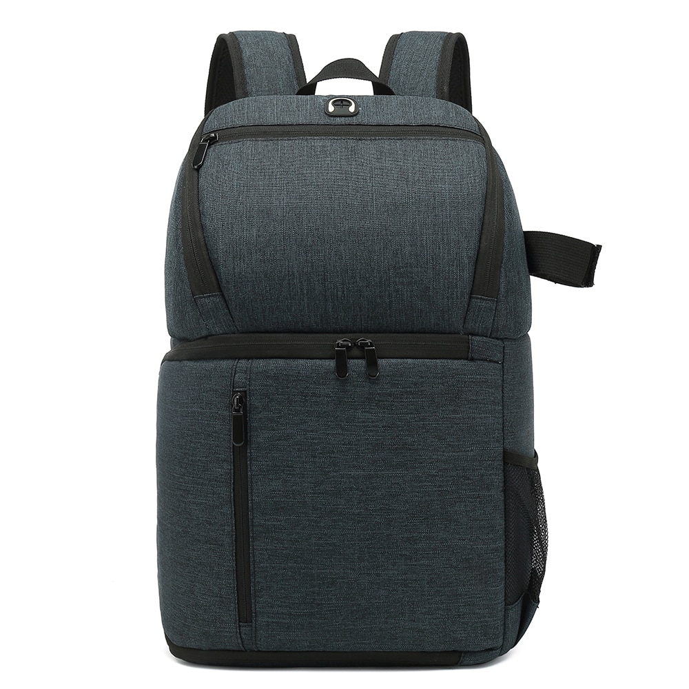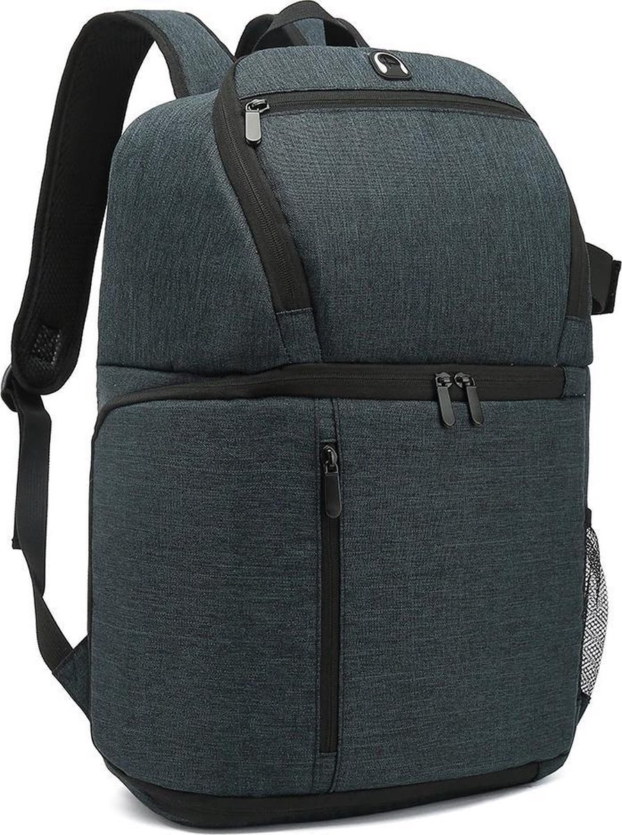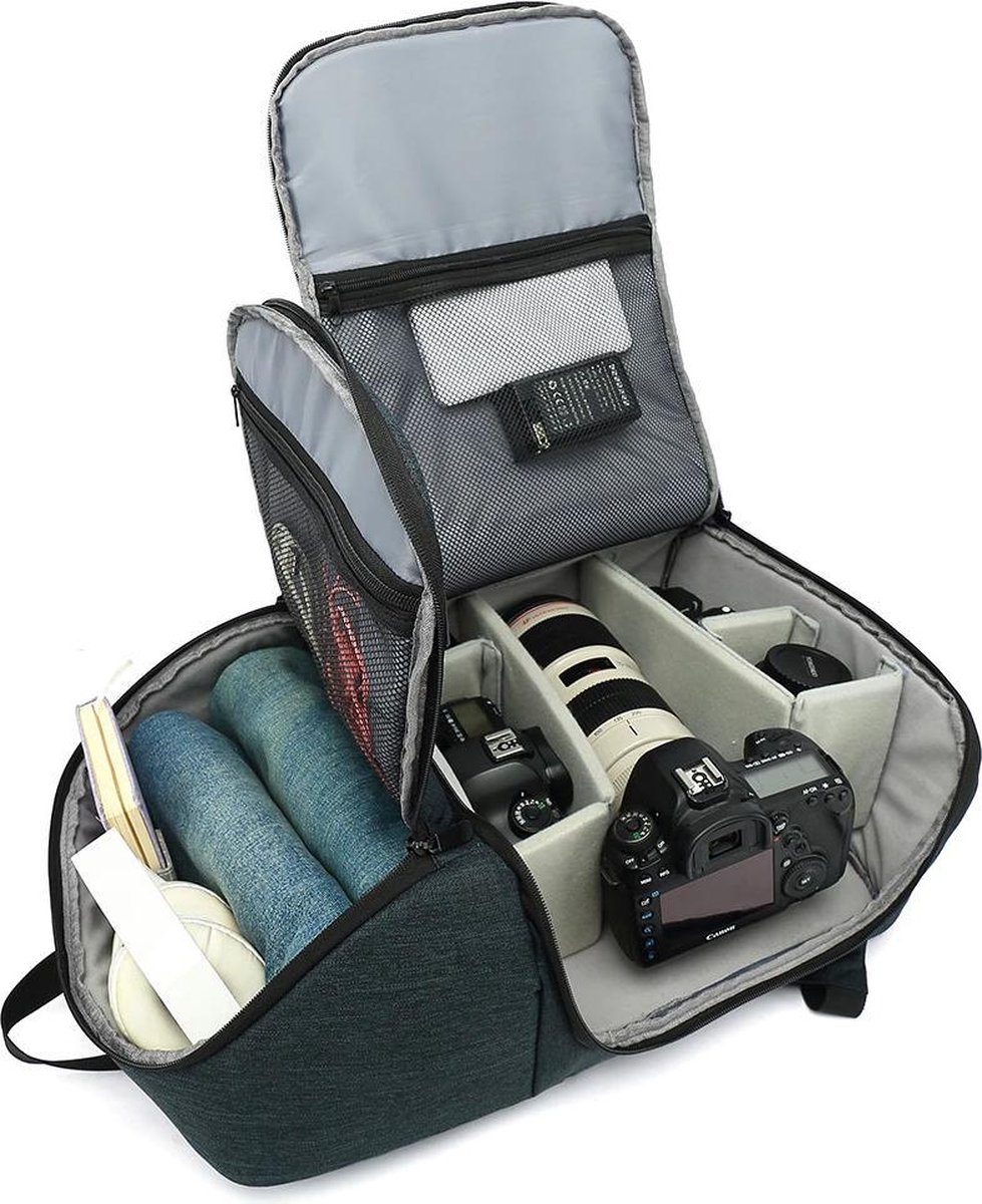 Deze handige en ontzettend ruime Camera Rugzak is de ideale keuze als je een hele dag op pad bent om te fotograferen of juist om je waardevolle camera apparatuur in op te bergen in huis. De camera rugzak is geschikt voor alle spiegelreflex camera’s met bevestigde lens, extra lenzen en andere accessoires zoals je laptop of macbook, actioncam’s, stabilizers etc. Zo is er bijvoorbeeld ook voldoende ruimte voor diverse opladers, flitser en zonnekap. Aan de zijkant bevestig je makkelijk je tripod en in het voorvak bovenin heb je ruimte voor extra accessoires die tegen een stootje moeten kunnnen. Aan de rugzijde schuif je gemakkelijk een 13.3 inch laptop, zodat je deze nooit kwijtraakt.