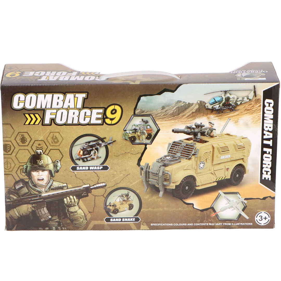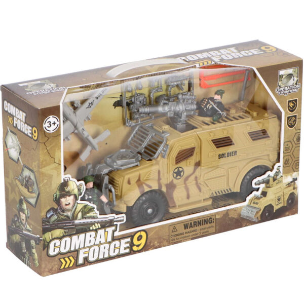Met deze wendbare Truck kan je in de droogste woestijnen rijden, patrouilleren en als het nodig is ben je direct klaar voor de aanval. Deze Combat Force Quick Vehicle Jeep is uitgerust met een draaibare mitrailleur zodat je de omgeving veilig kan stellen. Met de drone speur je de vijand gemakkelijk op. Met de diverse bijgeleverde accessoires is de uitrusting compleet. Inclusief een 10 centimeter groot militair speelfiguur. Geschikt voor kinderen vanaf 3 jaar.