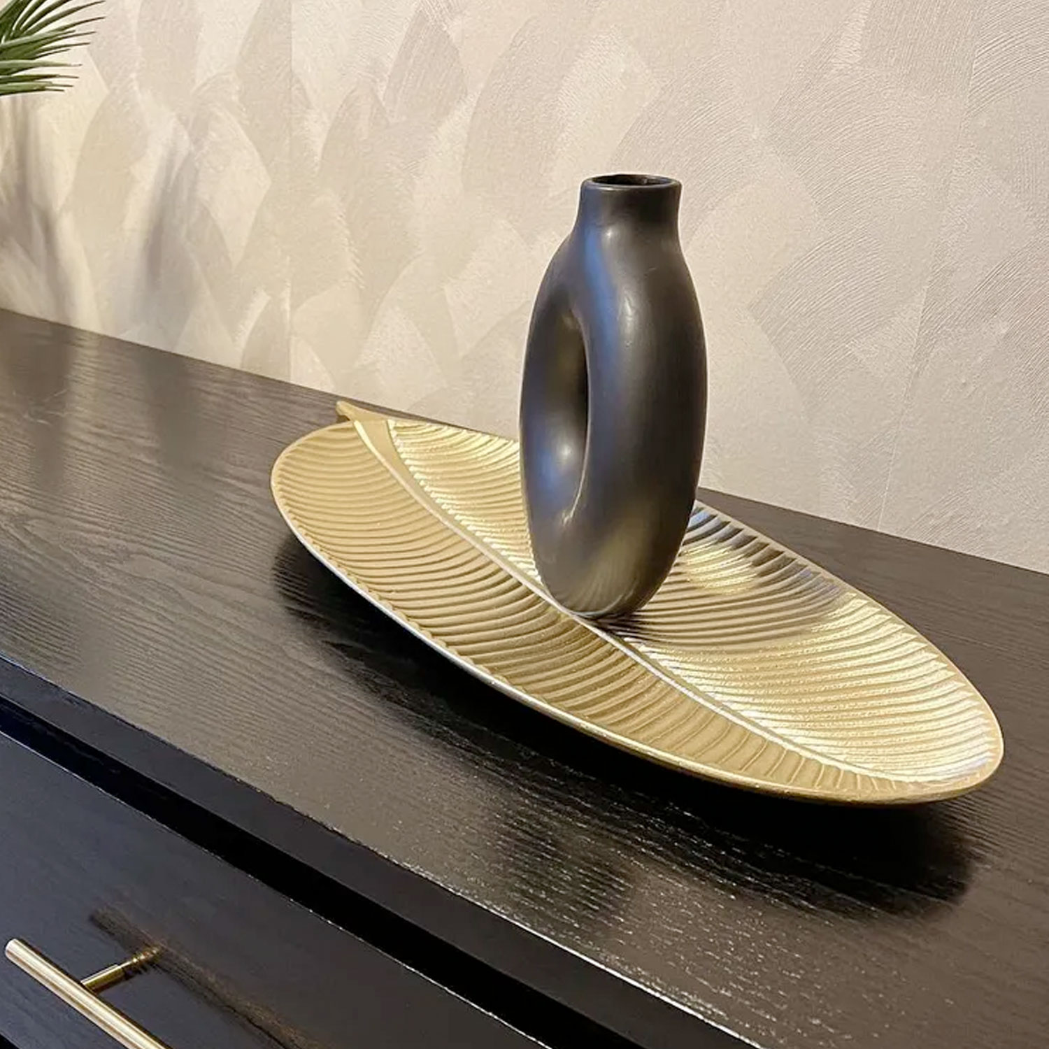 Ga voor een interieur dat luxe en subtiliteit uitstraalt met dit prachtige gouden decoratieplateau. Verrijk jouw woning met de schittering en pracht van goud en ervaar hoe de donkere tonen harmonieus samensmelten. Bestel nu en transformeer jouw huis in een stijlvolle oase van prachtige kleuren en verfijnde decoratie.