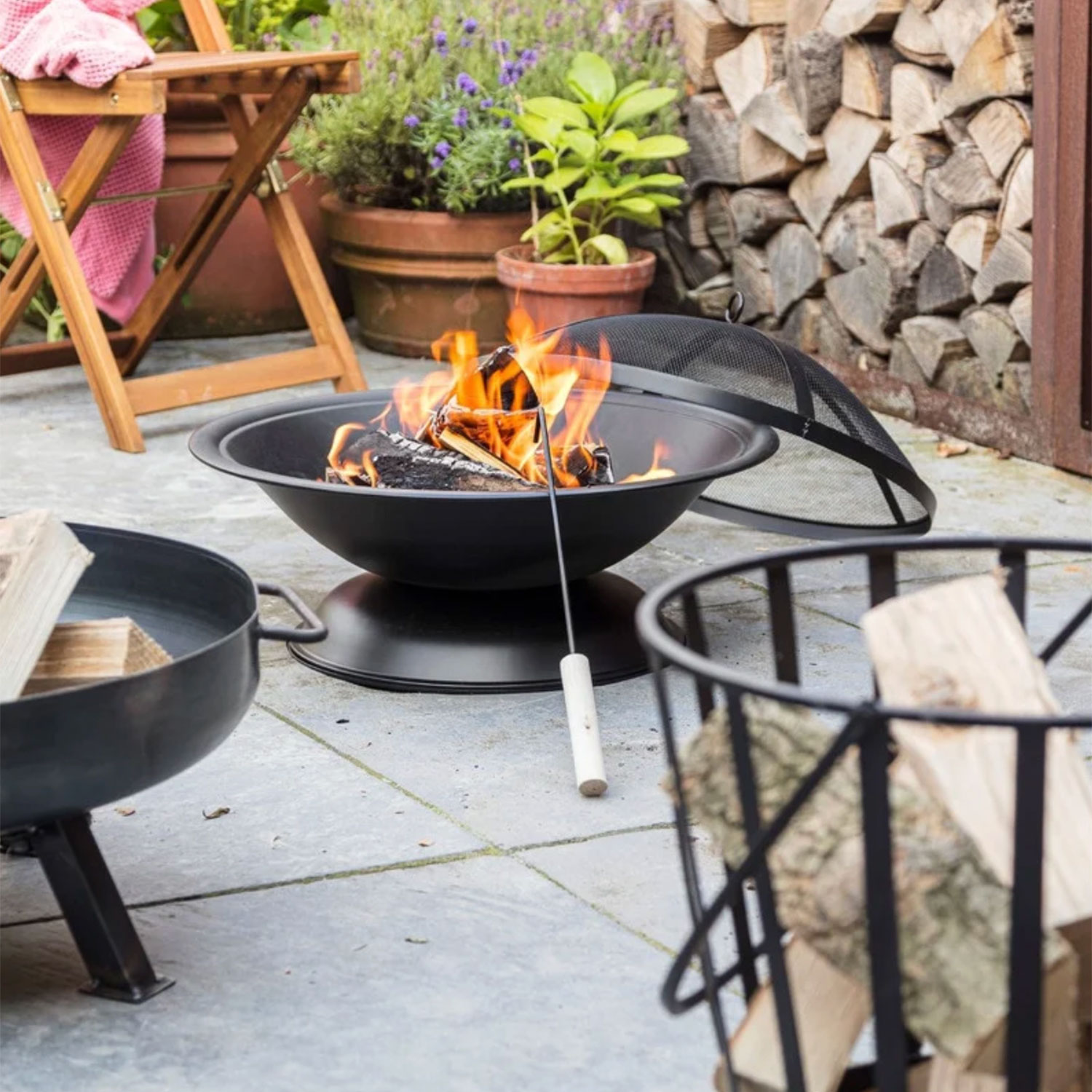 De vuurschaal staat stevig op vier poten, wat zorgt voor een stabiele en veilige positionering. Bovendien wordt een handige pook meegeleverd, waarmee je het vuur gemakkelijk kunt aanwakkeren en onderhouden.