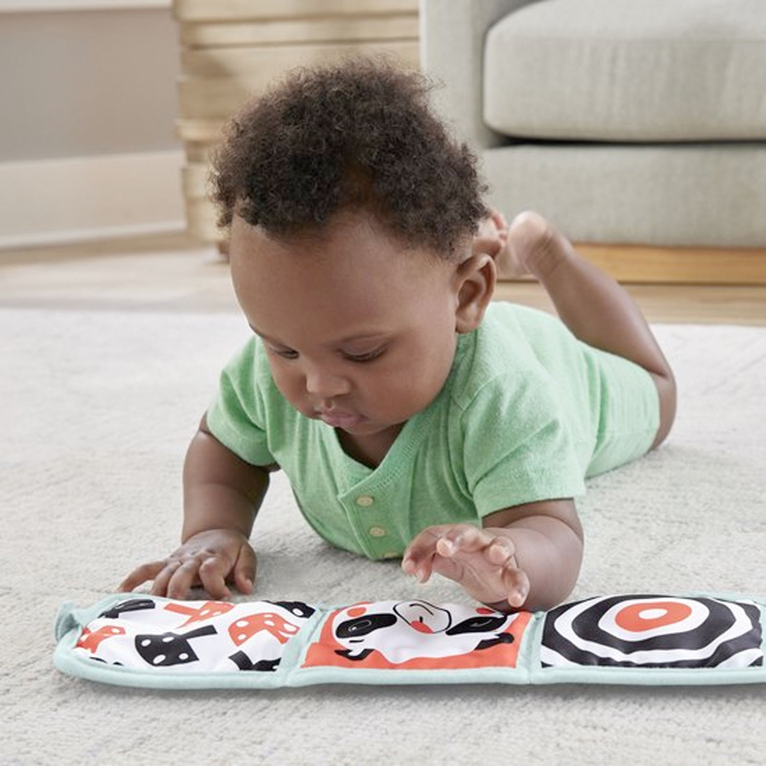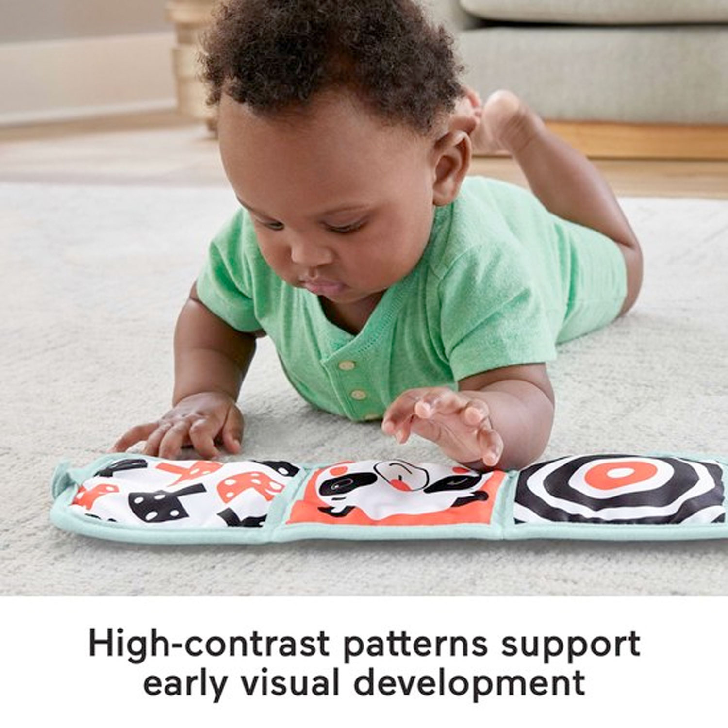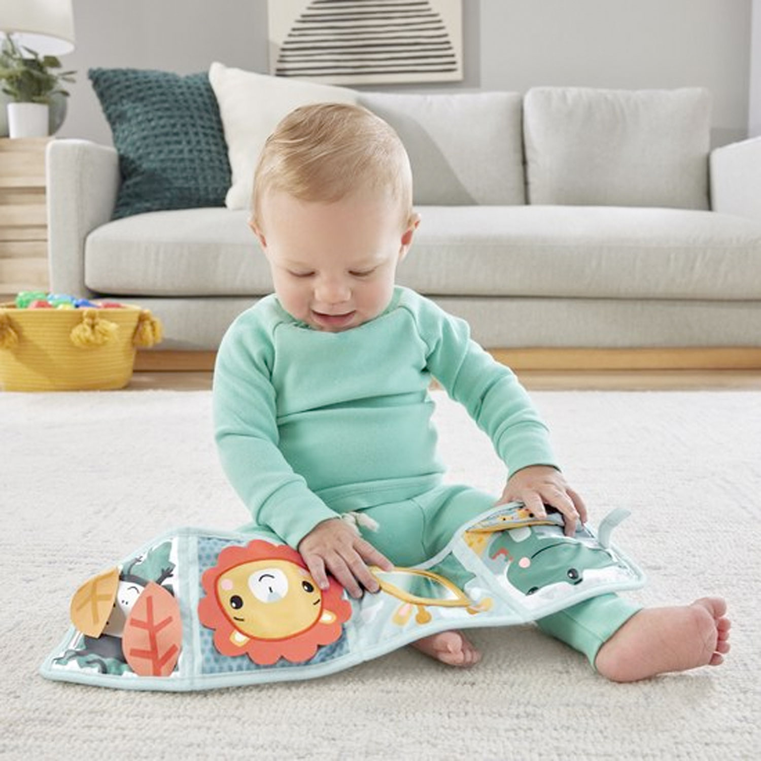 Fisher-Price Opvouwbaar Activiteitenspeelgoed Knisperboekje voor baby’s: vier dubbelzijdige vlakken met activiteiten die de zintuigen prikkelen. De vlakken kunnen gemakkelijk worden geplaatst voor op de buik of zittend spelen: plat op de grond, als een accordeon of in de vorm van een vrijstaande kubus. Met sterk contrasterende zwart-witpatronen, vrolijk gekleurde dierenvriendjes en leuke activiteiten op elk vlak, biedt dit zachte activiteitenspeeltje je baby urenlang speelplezier.
