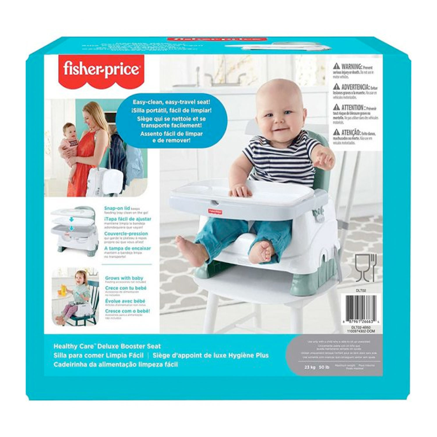 FISHER-PRICE Healthy Care DELUXE Booster Seat voor voeding vanaf 6 maanden. Groeit met je baby mee! Maak maaltijden nog lekkerder met de Healthy Care Deluxe Booster Seat. Kenmerken zijn onder andere een comfortabele zitting met drie hoogte-instellingen, zodat deze op elke tafel past, en riempjes aan de voor- en achterkant, zodat de zitting op vrijwel elke stoel past. Dankzij de vaatwasserbestendige lade en inzet en de eenvoudig af te nemen oppervlakken lijkt het erop dat je maaltijden een stuk minder rommelig worden! Onderweg is Geen probleem. Klik het deksel van de eetlade eenvoudig dicht, zodat de plek waar je baby eet lekker schoon blijft.