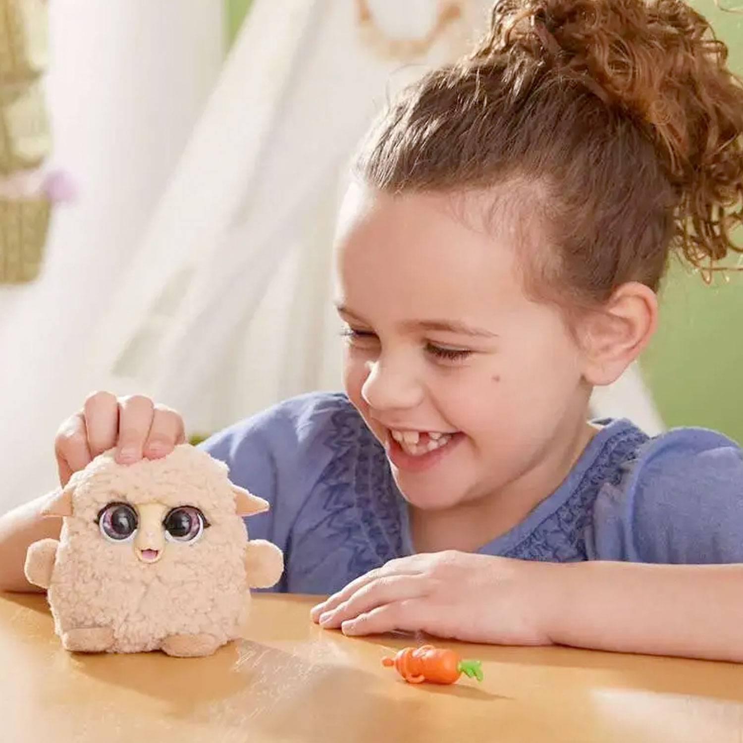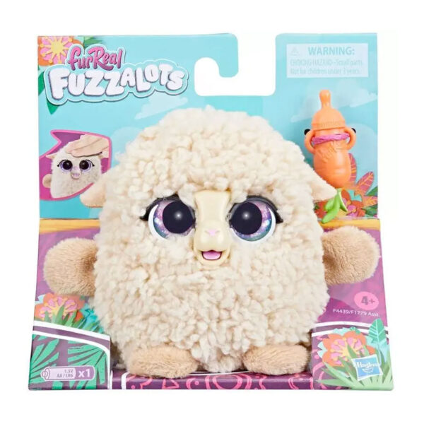 Deze furReal Fuzzalots Lam Interactief speelfiguur onthult haar vele stemmingen door middel van kleur en geluid. Als het huisdier honger of dorst heeft, gloeit ze rood (en ze is niet erg blij!). Geef haar haar flesaccessoire voor een heel blij huisdier. Als ze verdrietig, bang of chagrijnig is, gloeit haar buik blauw om kinderen te laten weten dat ze nog wat meer knuffels nodig heeft! Aai haar over haar hoofd en ze zal meteen kalmeren. Het is zo leuk om te weten hoe je voor deze harige elektronische vriend moet zorgen. Een geweldige, kleurrijke vriend voor kinderen van 4 jaar en ouder!