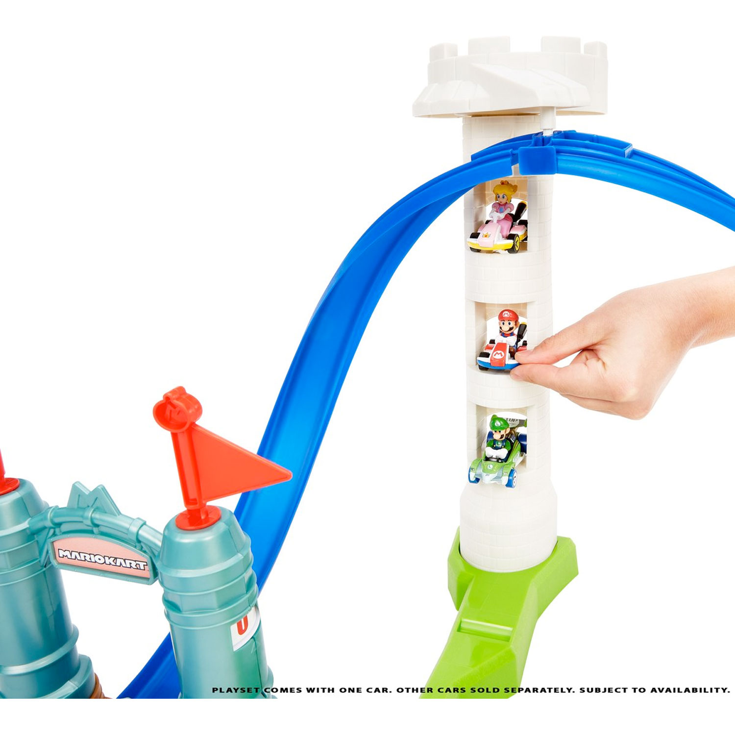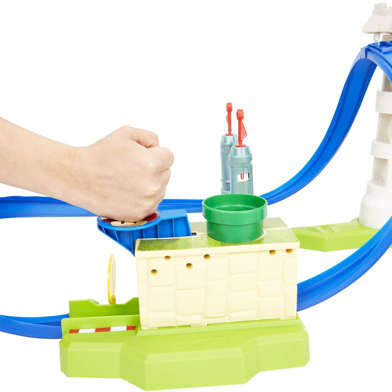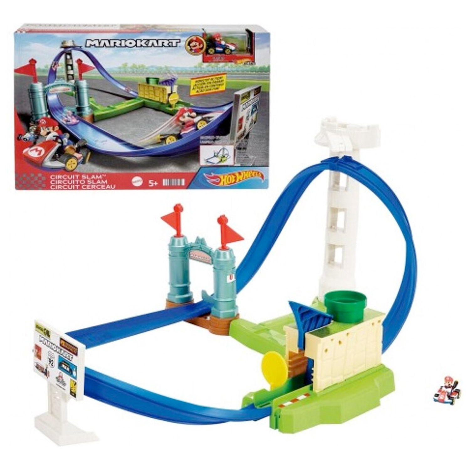 Met de Hot Wheels Mario Kart Circuit Slam baanset breng je de spanning van het iconische videospel rechtstreeks naar je speelkamer. Race, stunt en versla de zwaartekracht terwijl Mario zijn weg over het circuit baant!