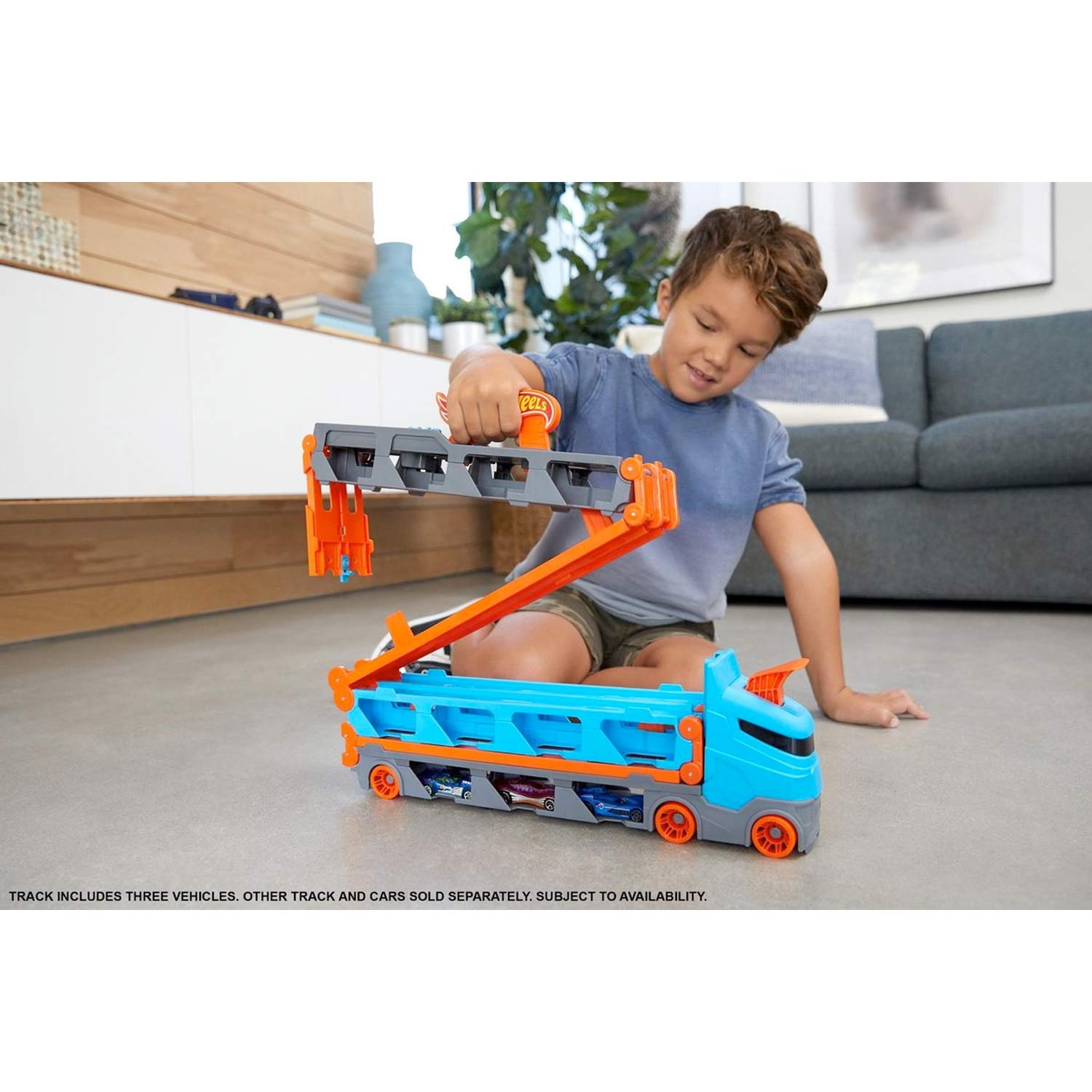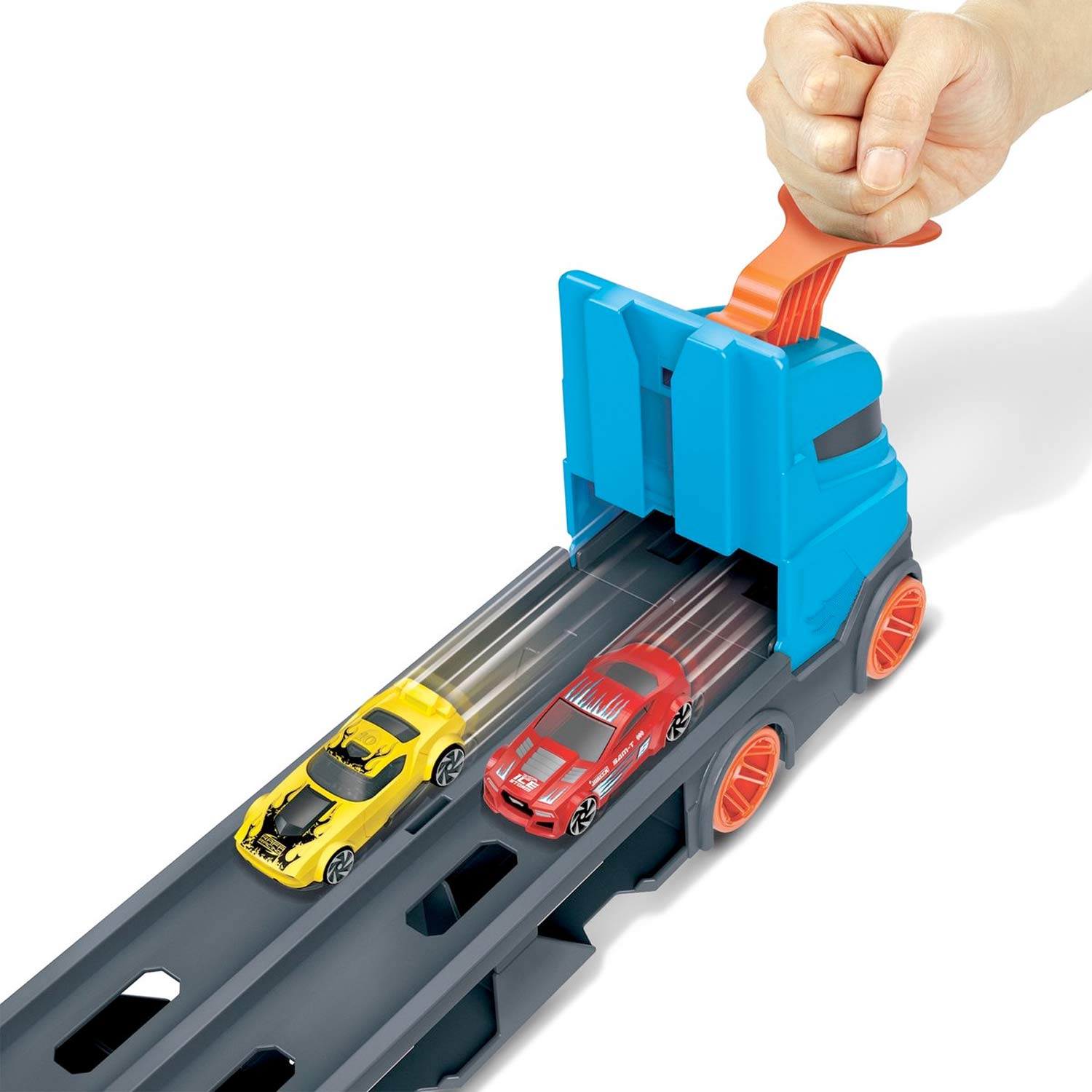 • De massieve semi-vrachtwagen is op zichzelf al supercool speelgoed, maar hij dient ook nog als opslag voor maximaal 22 voertuigen (apart verkrijgbaar). Het 3-in-1-speelgoed verandert ook in een racecircuit van 180 cm lang, met een dubbele lanceerinrichting voor wedstrijdracen.