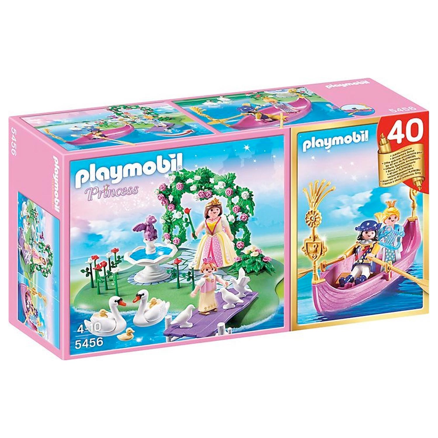 Stap vervolgens aan boord van de romantische gondel voor een betoverende rit met de knappe prins. Wacht op de boot aan je privésteiger en laat je meevoeren naar nog meer avontuur en plezier! Deze speciale set is een eerbetoon aan 40 jaar Playmobil en biedt twee opwindende speelsets in één schitterende verpakking.