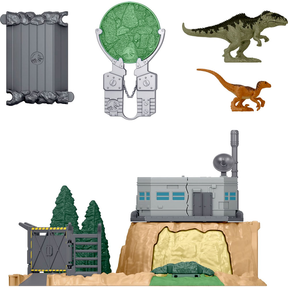 De set wordt geleverd met twee mini-dinosaurussen, waaronder de Giganotosaurus die is geïntroduceerd in Jurassic World Dominion. Ze zijn klaar voor dinosauruschaos – lanceer en vernietig! Deze mini-speelset kan ook worden verbonden met de Mosasaurus Mayhem™ speelset en heeft de perfecte maat om te spelen met Jurassic World Matchbox™-voertuigen.