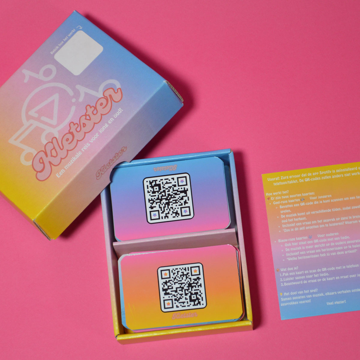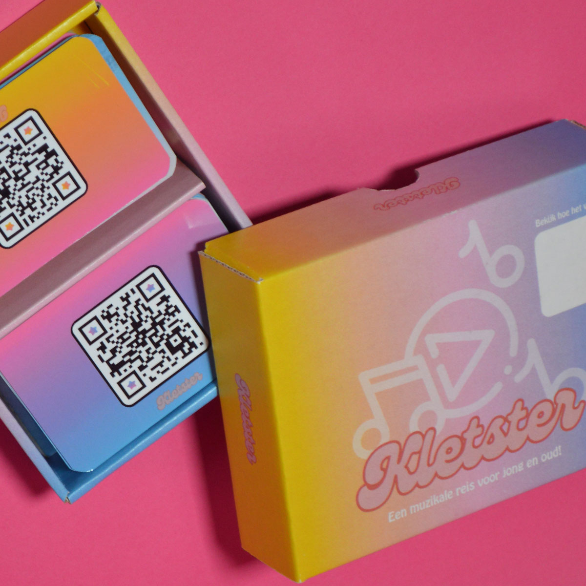 Of je nu met vrienden, familie of collega’s speelt – jong of oud – Kletsters brengt iedereen aan het praten én aan het luisteren. Een unieke mix van gesprekskaarten, QR-codes en muziekfragmenten maakt dit spel onweerstaanbaar boeiend en heerlijk persoonlijk.