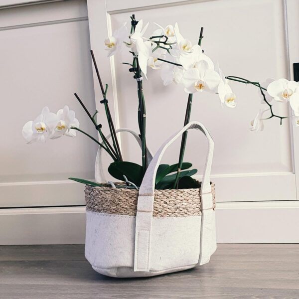 Deze natuurlijke plantenmand van vilt en zeegras is een prachtige manier om seizoensbloemen te presenteren. De mand kan binnen of buiten worden gebruikt en is een attent cadeau voor Moederdag of elk moment van het jaar. Plantenmand van vilt en zeegras met schattig hengsel voor een gezellige buitenruimte. Natuurlijke materialen zijn zacht voor de handen, terwijl de stroachtige vezel luchtigheid toevoegt aan je hoek van de tuin of huis. Gemaakt van vilt en natuurlijk zeegras.