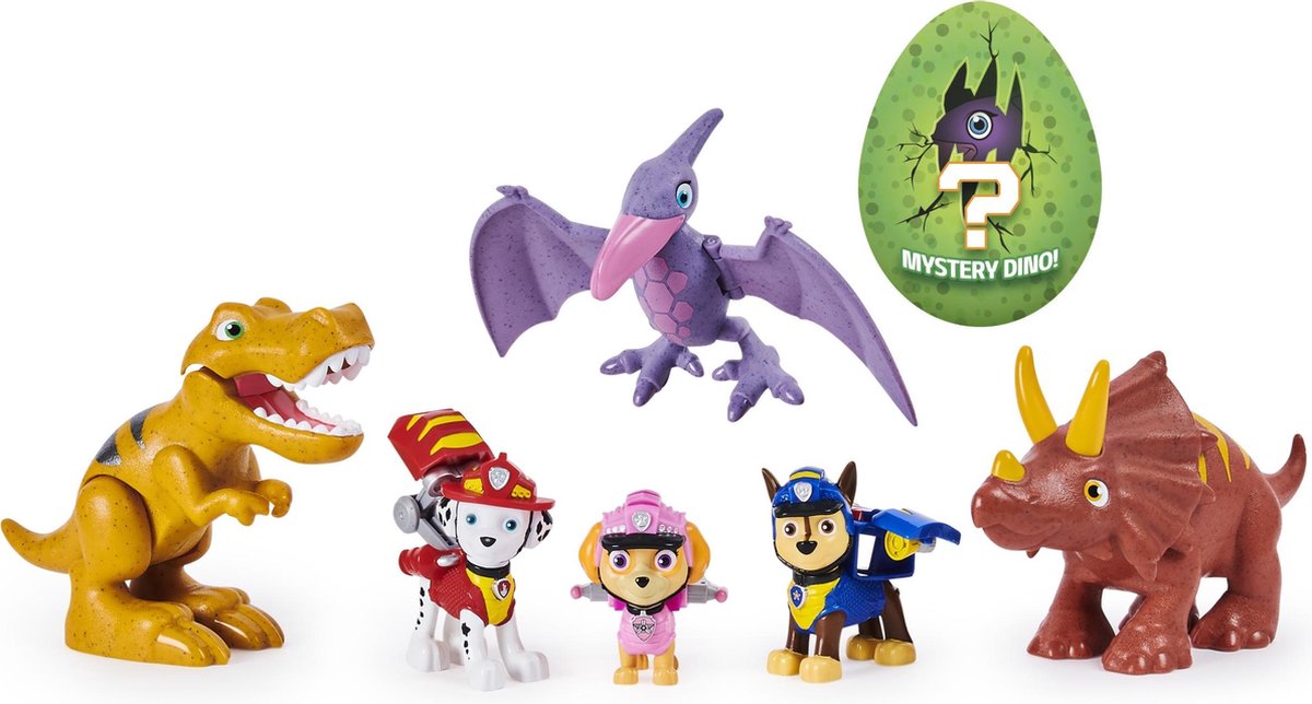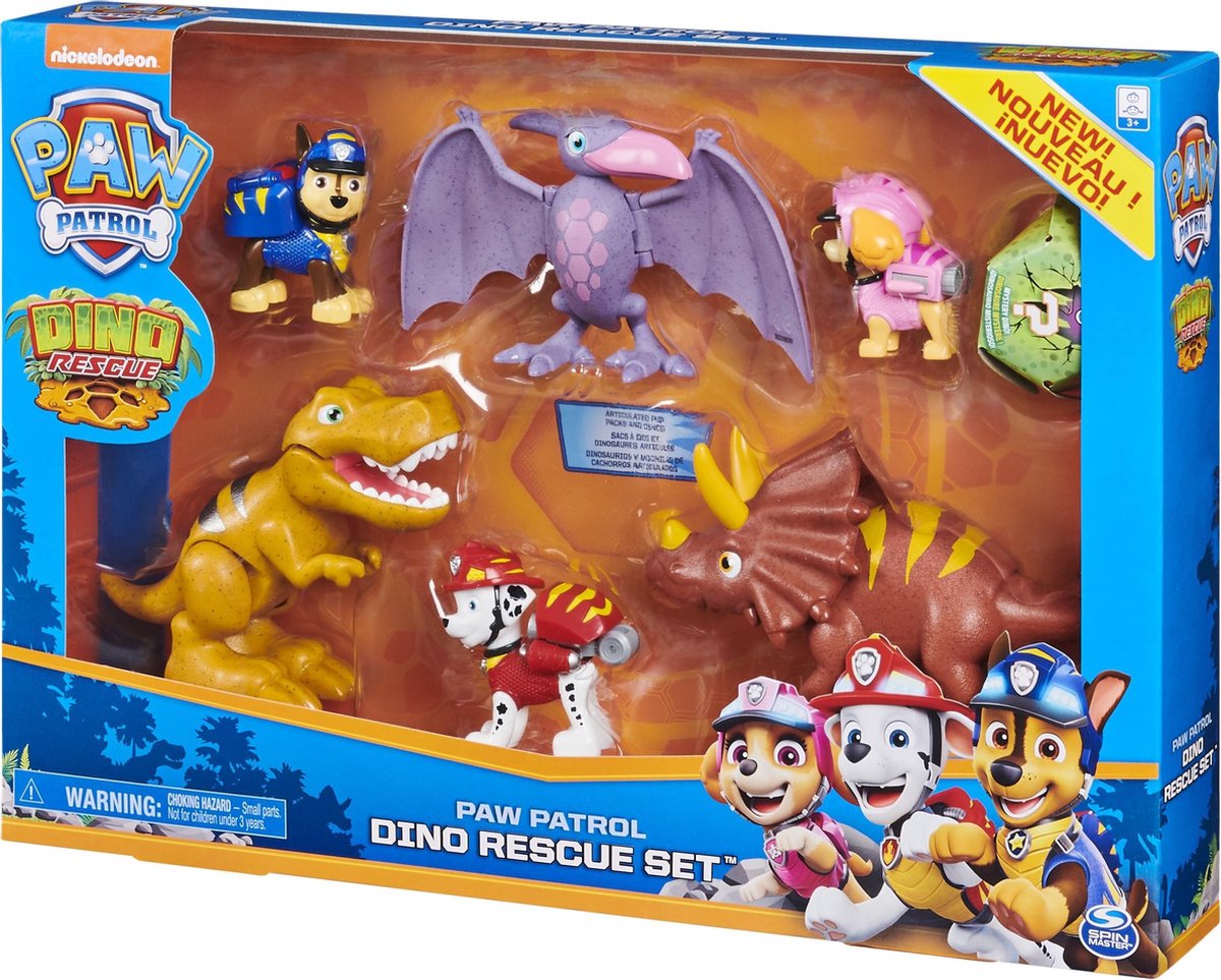 Spring in actie met de PAW Patrol Dino Rescue Set! Deze Paw dinosaurus cadeauset wordt geleverd met drie PAW Patrol-verzamelfiguren, drie dinosaurusfiguren en een mysterieuze dino-minifiguur! Chase, Marshall en Skye zijn voorbereid in hun robuuste Dino Rescue-uniformen, klaar om de dag te redden.