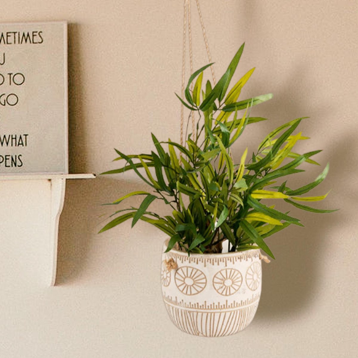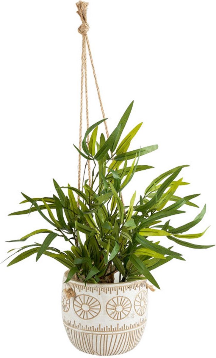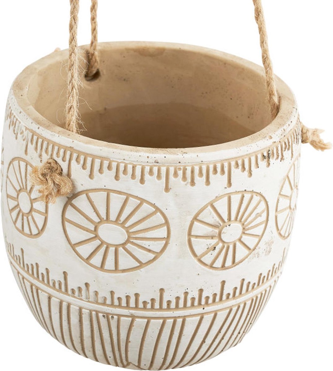 Dit is een speciale plantenhanger! Je favoriete planten of bloemen hang je gemakkelijk in de lucht met deze planthanger Wit met Aztec tekens van fijn aardewerk. De hangpot is bevat prachtige decoratie met mooie tekens en daardoor ziet je omgeving er direct Latijns-Amerikaans uit. Haal iets speciaals in huis en tover je woonkamer of balkon om in een totaal andere stijl. De pot heeft een diameter van 14 cm en de hoogte is 13 cm, een goed formaat dat past samen met andere accessoires. Het jute touw heeft een lengte van 40 cm en je hangt hem eenvoudig op aan de lus op elke gewenste locatie.