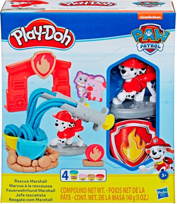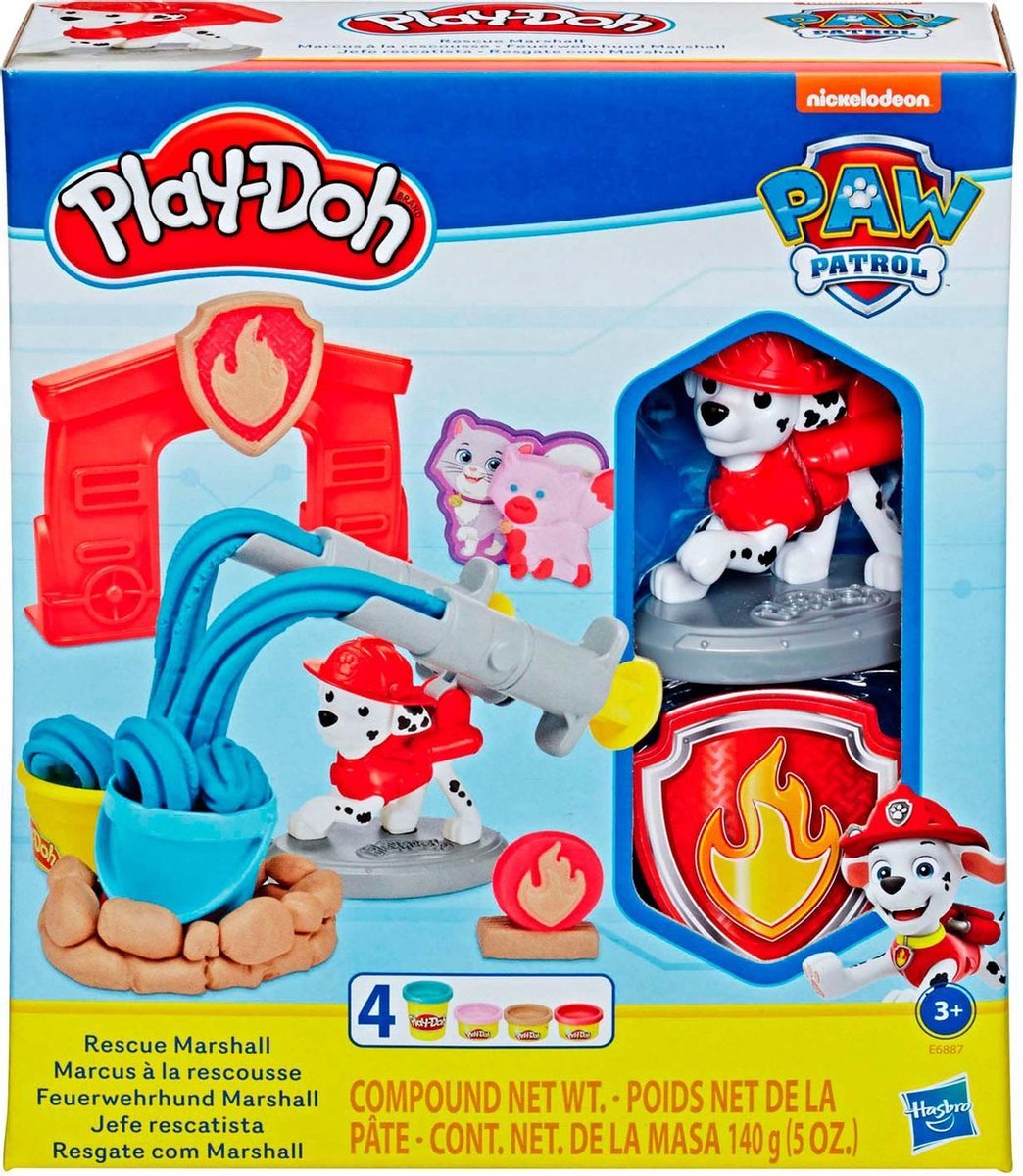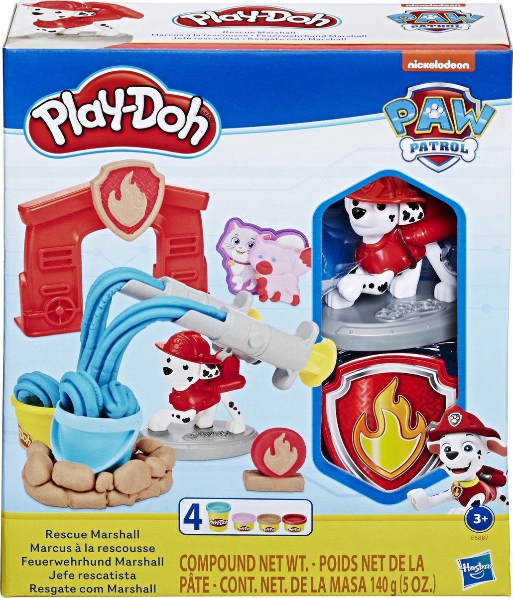 De Marshall figuur fungeert als een stamper om Play-Doh houten balken te creëren om targets te creëren, en zijn puphuis creëert meer mogelijkheden om kinderen te helpen hun eigen verhaal vertellen op basis van hun favoriete hit tv-show. Stamp Cali de kat en de Marshall’s brandbestrijders badge met de stempels voor meer fantasiespel. Deze set bevat 3 potjes Play-Doh van 28 gram en 1 potje van 56 gram. Dit creatieve speelgoed maakt een goede regenachtige dag activiteit of cadeau voor kinderen vanaf 3 jaar oud die graag creatief met squishy materialen, zoals klei te werk gaan.
