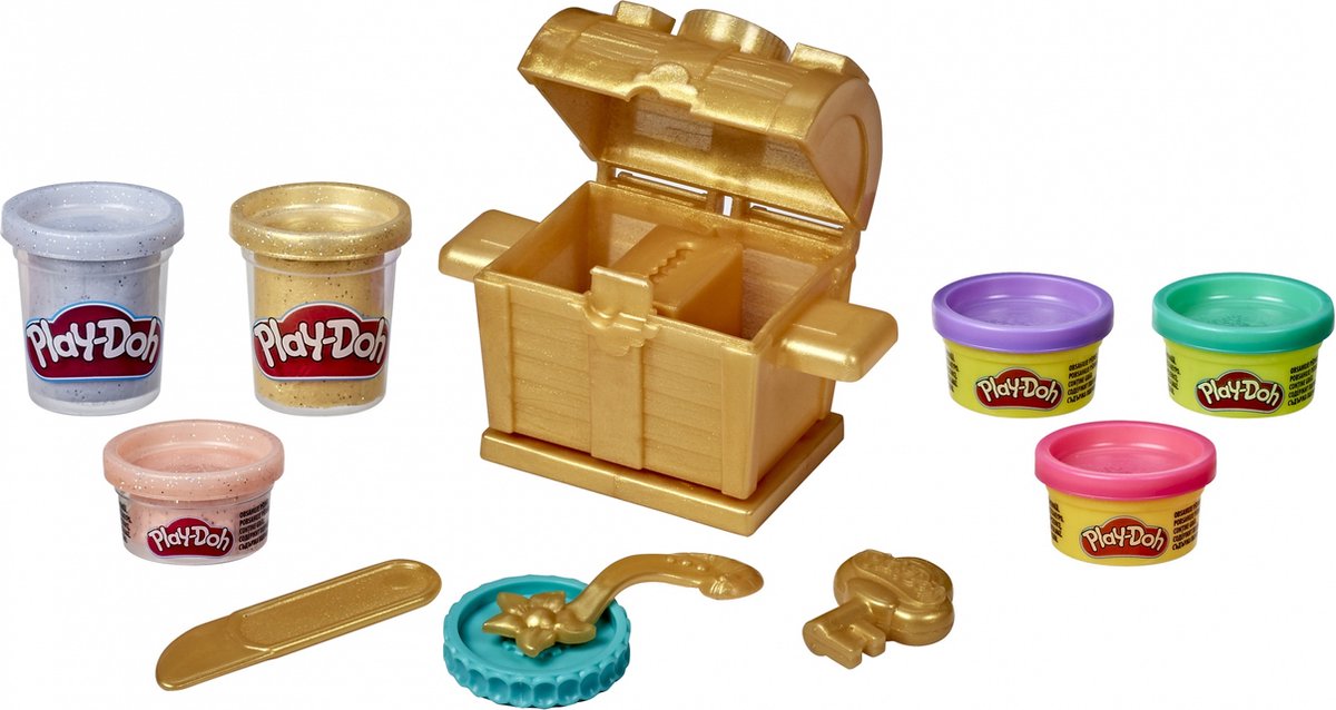 Maak deze glinsterende schatkist open met je eigen Play-Doh klei speelset! Met deze gereedschappen maak je de meest fantastische sieraden en armbanden. In de gouden schatkist maak je alle glinsterende muten, kettingen en diamanten, je kunt alles zelf vormgeven met Play-Doh. Maak iedereen jaloers op je goudschat en maak de kist open met je Play-Doh sleutel. Creeer de gaafste sieraden met een echt patroon en verstop de schat waar niemand hem kan vinden!