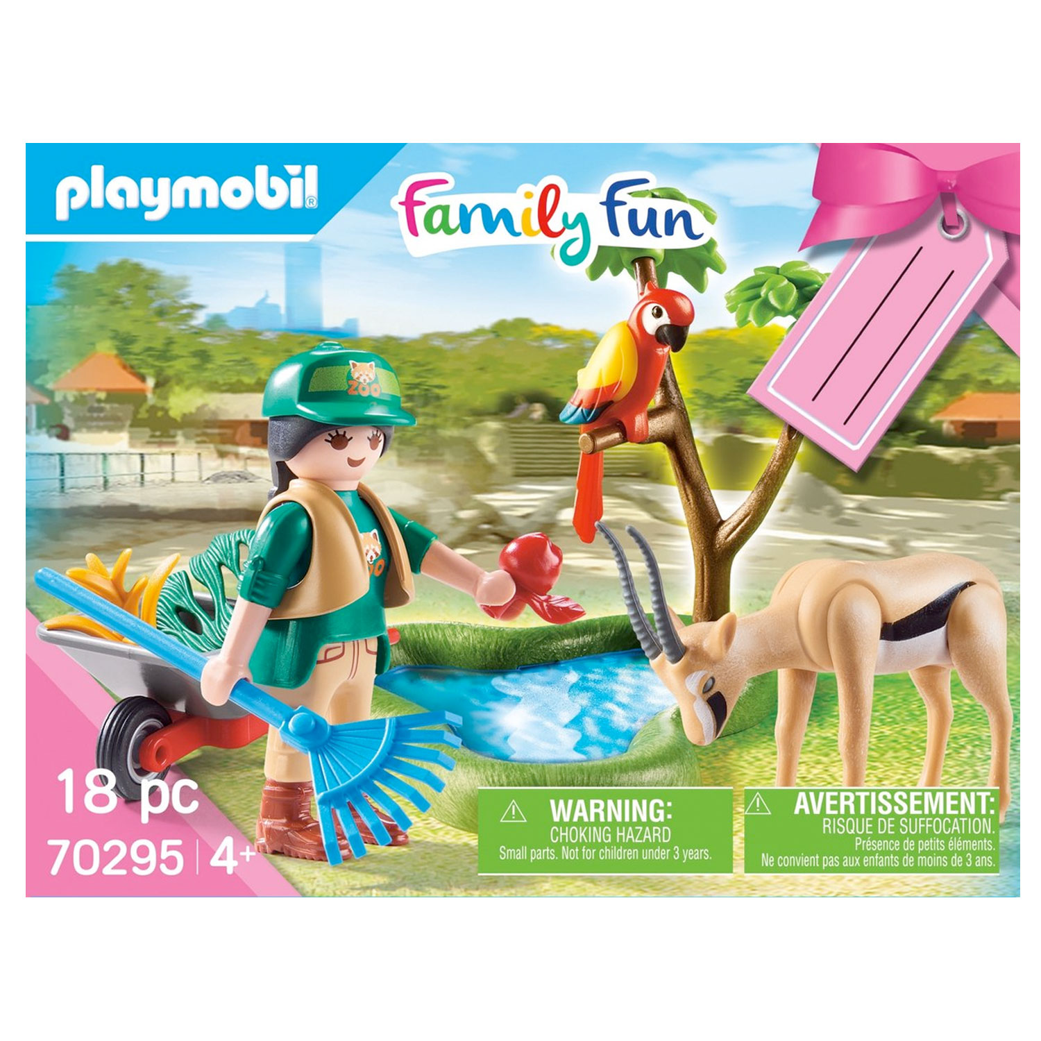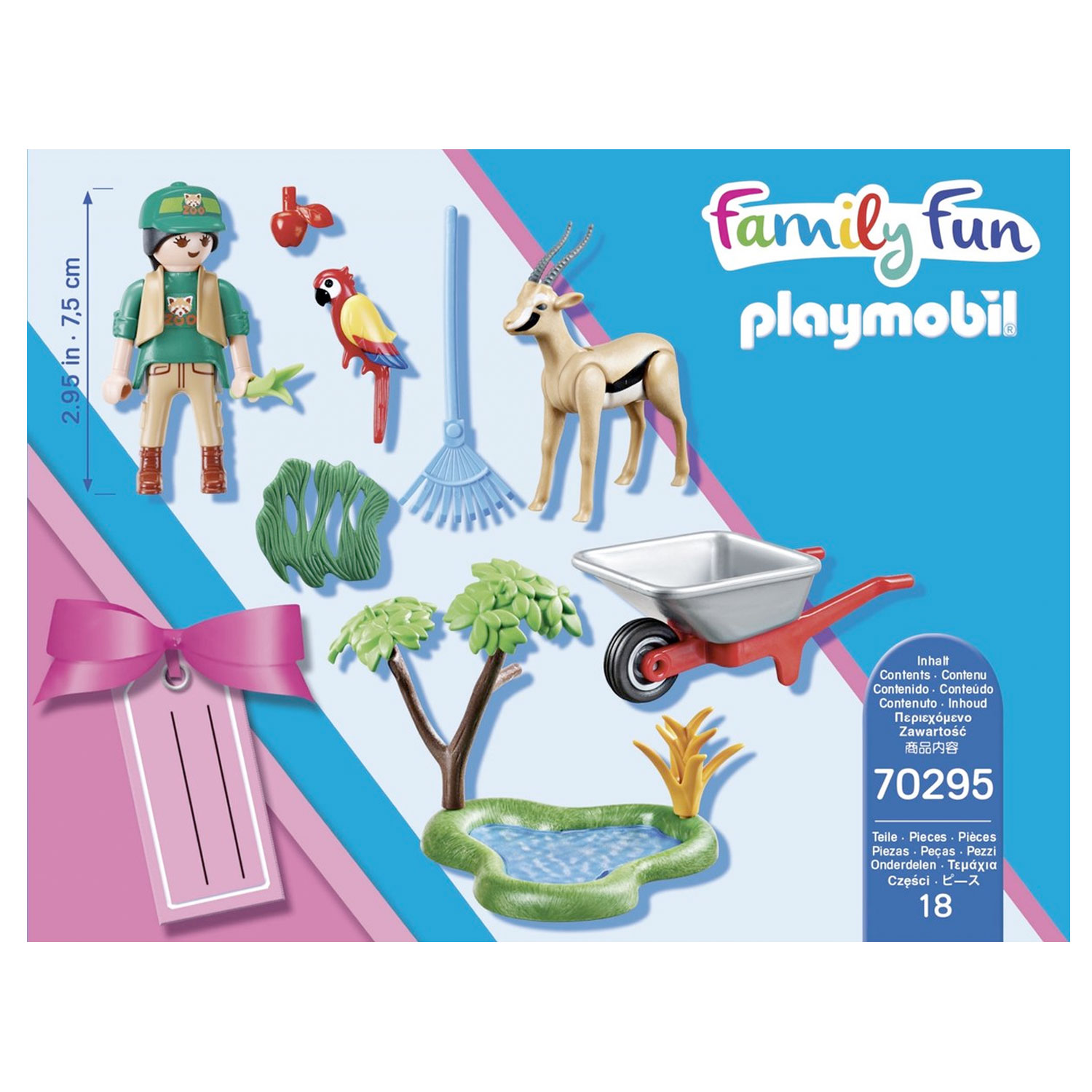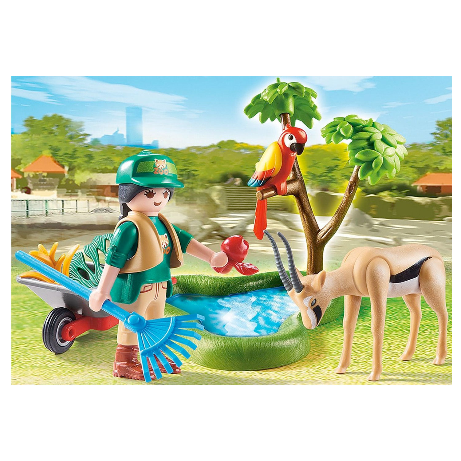 De dierenverzorgster in de dierentuin zorgt goed voor alle dieren. Ze brengt vers voer naar een van de dieren en controleert het water dat bij de drinkplaats staat. Natuurlijk is ze pas tevreden als alle Playmobil Dieren in orde zijn. De papegaaien in de boom volgen elke stap en geven soms ook commentaar. Een perfecte speelset van Playmobil voor liefdevolle dierenliefhebbers. Geschikt voor kinderen vanaf 4 jaar.