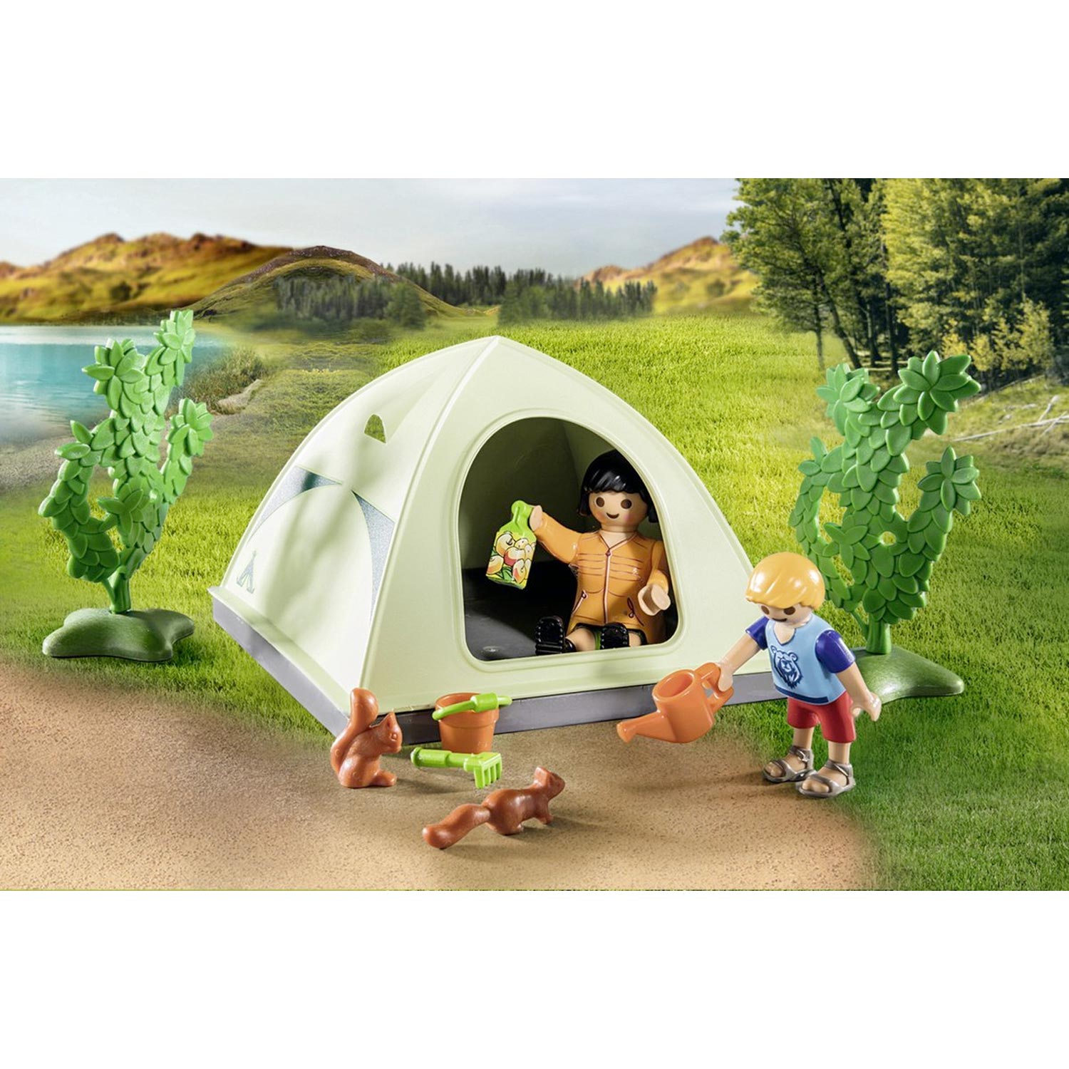 Deze set bevat alles wat kinderen nodig hebben voor een leuke vakantie onder de heldere hemel. Een keuken en een sanitaire ruimte zorgen voor comfort in het dagelijkse kampeerleven. Zodra de tent en het kampeermeubilair staan, kletsen de PLAYMOBIL vakantiegangers al met hun campingburen. Er is altijd iets te beleven op de PLAYMOBIL camping!