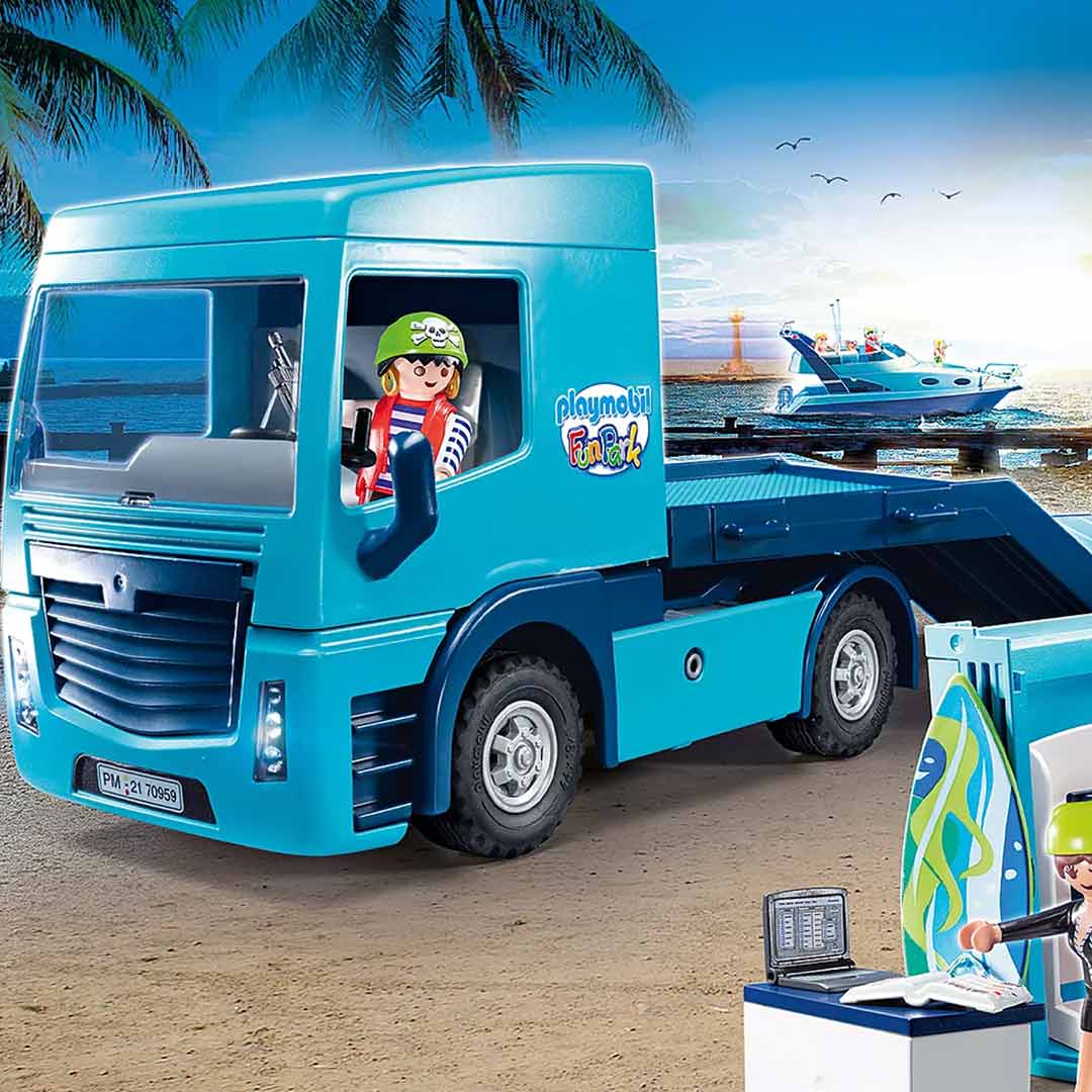 Help Sammy met het zware transport! De slimme piraat rijdt net de grote dieplader vrachtwagen met container binnen en nu kan hij de zware vracht van de vrachtwagen voorzichtig te lossen. In de zee container op de laadruimte van de dieplader, die overigens ook geschikt is om de Playmobil Family Fun speelgoed Speedboot te vervoeren, staat een volledige set surf uitrusting inclusief verkoopbalies, planken en snorkel spullen.
