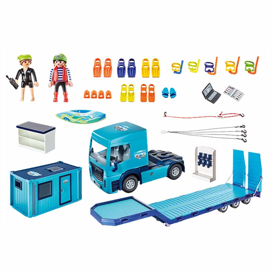 Langzaam rijdt Piraat Sammy de vrachtwagen dieplader voor, klapt de oprijplaten naar beneden en vervolgens wordt de container voorzichtig gelost, er mag immers niets kapot gaan, maar dat is natuurlijk geen probleem voor Sammy! Deze speelgoedset bevat twee PLAYMOBIL®-figuren, een grote dieplader (50cm) met een container, een verkoopruimte en een toonbank met surfuitrusting en veel andere extra’s voor spannende rollenspel en wordt geleverd in 139 onderdelen.
