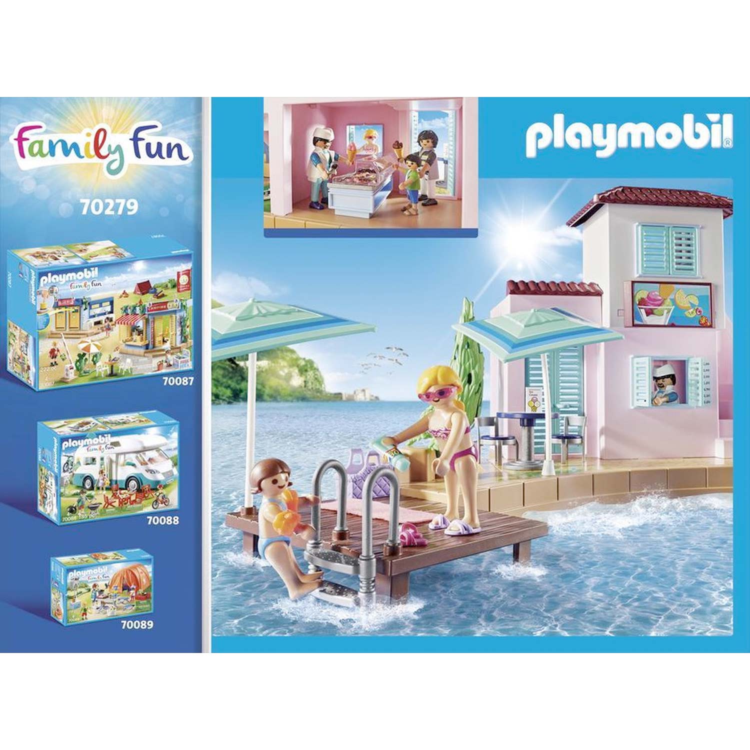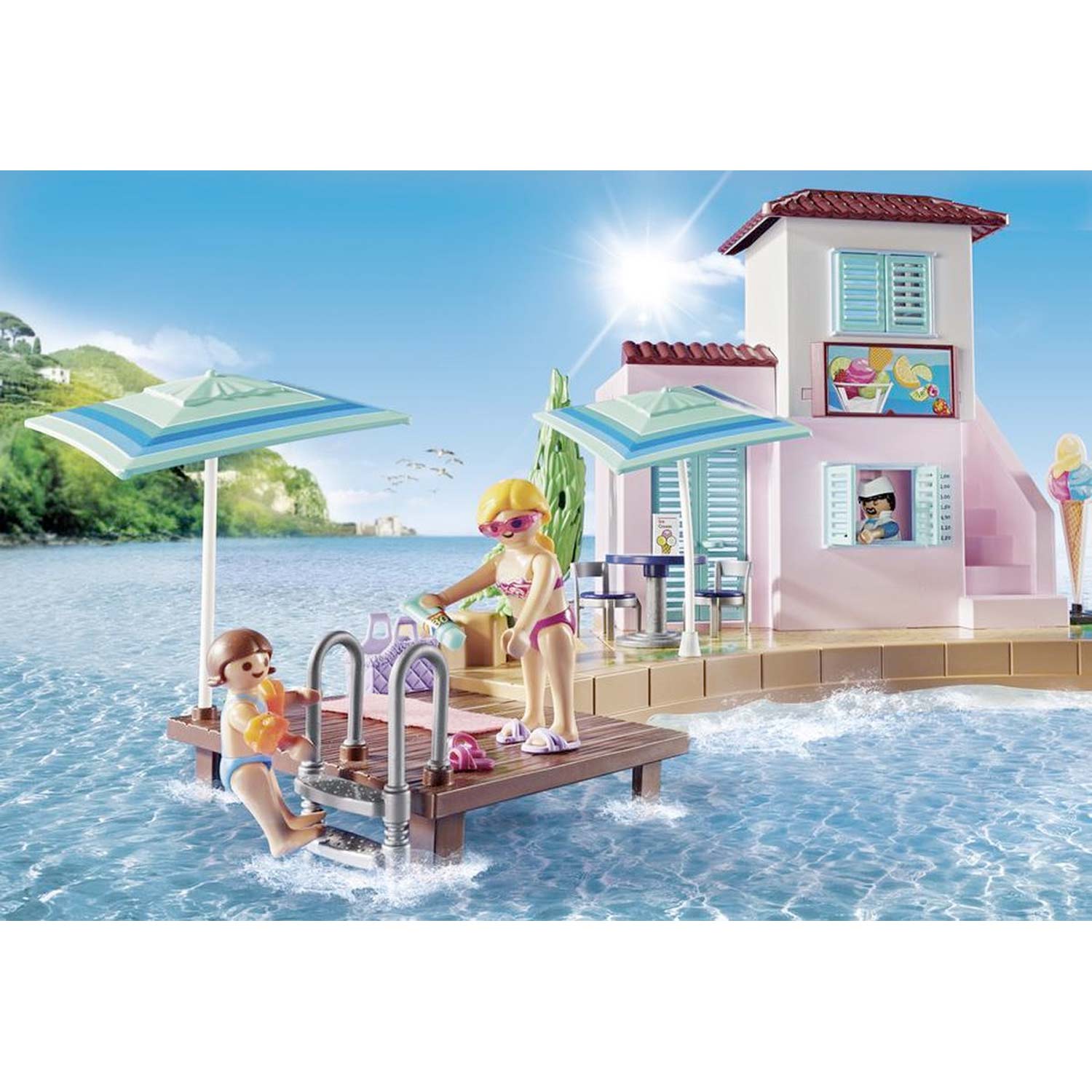 Ontdek het plezier van de Playmobil IJssalon aan de Haven! Deze levendige set biedt de perfecte plek om van heerlijk ijs te genieten. Met tafels voor de ijswinkel en een gezellig terras op de bovenste verdieping, nodigt deze speelset jonge avonturiers uit om te genieten van verfrissend ijs met uitzicht op de haven. Het ijs kan zelfs worden meegenomen door badgasten en wandelaars op de aangrenzende wandelpromenade.