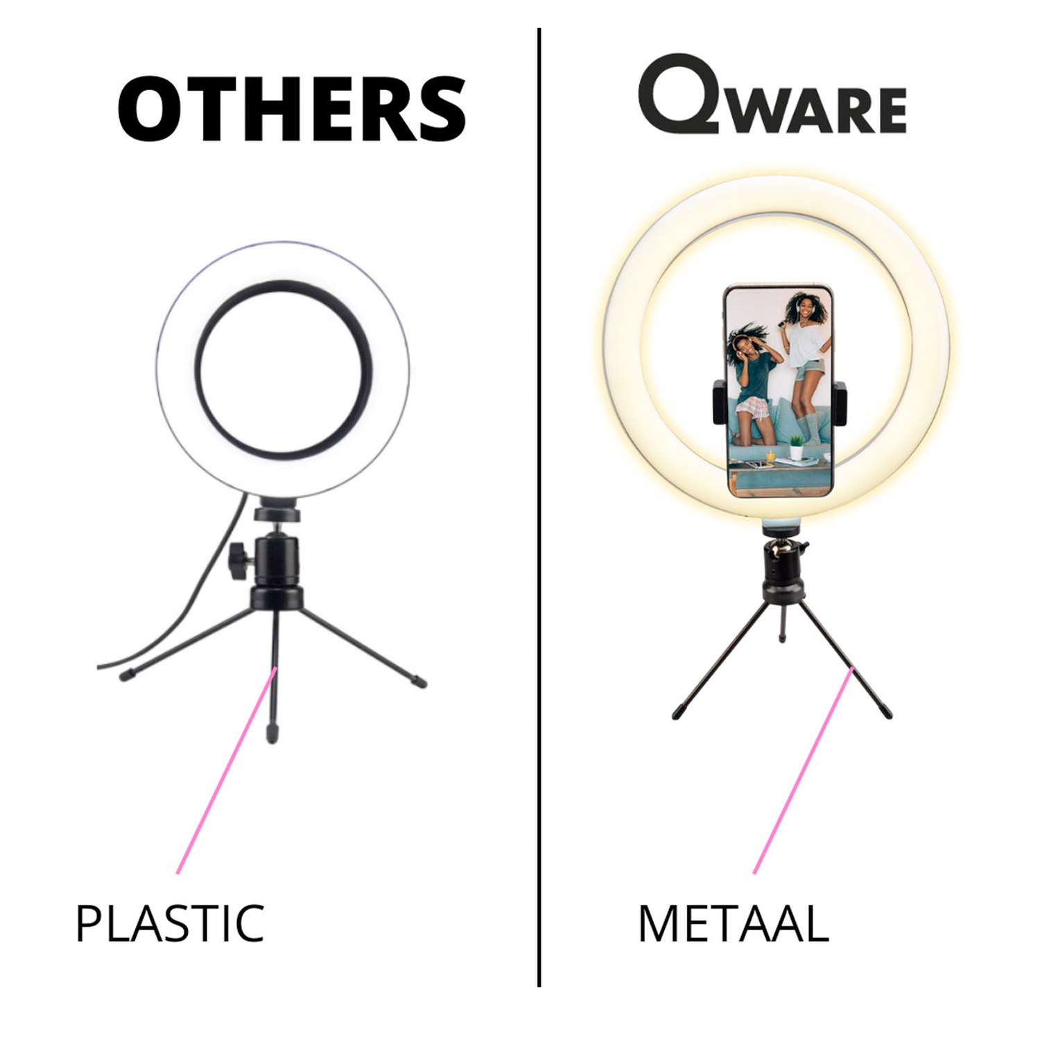 De Qware® Ringlamp heeft een statief van extra hoge kwaliteit. Dit is is natuurlijk erg belangrijk omdat je tijdens het opnemen van een video/Tiktok geen trillingen of andere verstoringen door je video’s wilt.