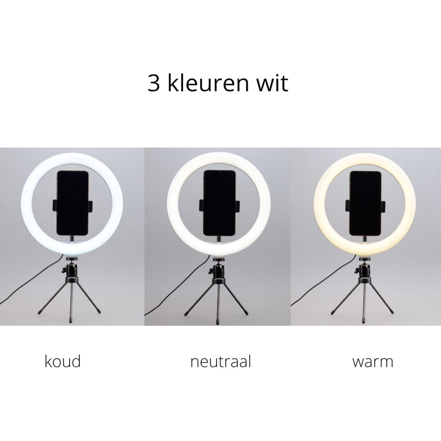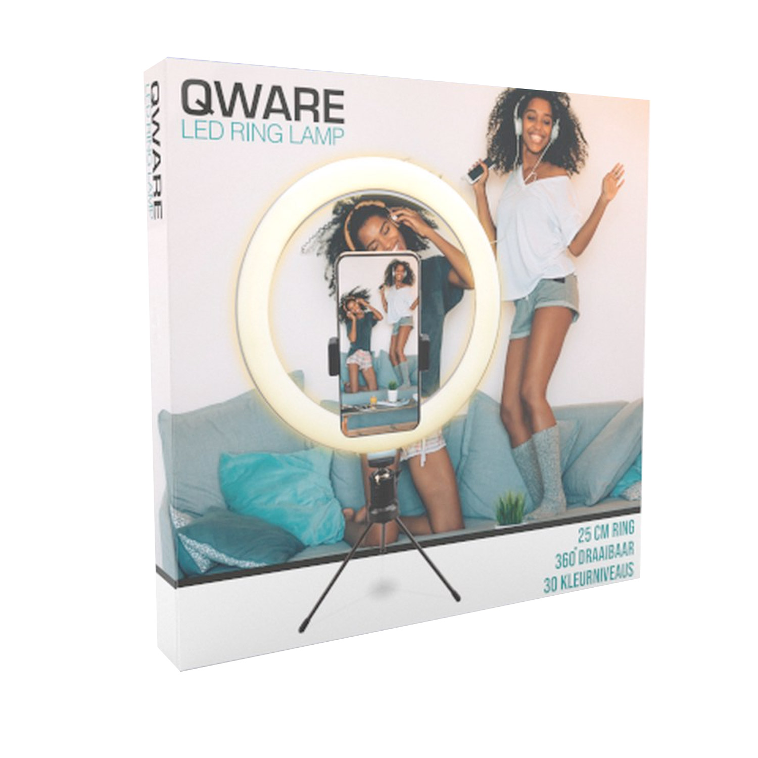 Zoek jij ook naar de perfecte belichting voor het maken van selfies, vlogs of TikToks? Dan is de Qware® 10 Inch (circa 25 cm) LED Ringlamp met tripod de perfecte oplossing voor jou! Plaats je mobiel in de smartphonehouder, zet het statief in de meest comfortabele positie, regel het licht en begin met opnemen! Hoogte van de tripod is 15 cm. De 25 centimeter ringlamp is volledig horizontaal of verticaal te plaatsen en met het witte, gele of gemixte licht zijn jouw foto’s professioneler dan ooit! Via de remote in de kabel in te stellen: 3 verschillende licht kleuren (wit, naturel en warm) en iedere licht kleur met 9 verschillende helderheid niveaus. Je hebt dus 9 niveaus om te dimmen of helderder te maken per licht kleur. Ook zonder ringlicht te gebruiken als selfie-stick.