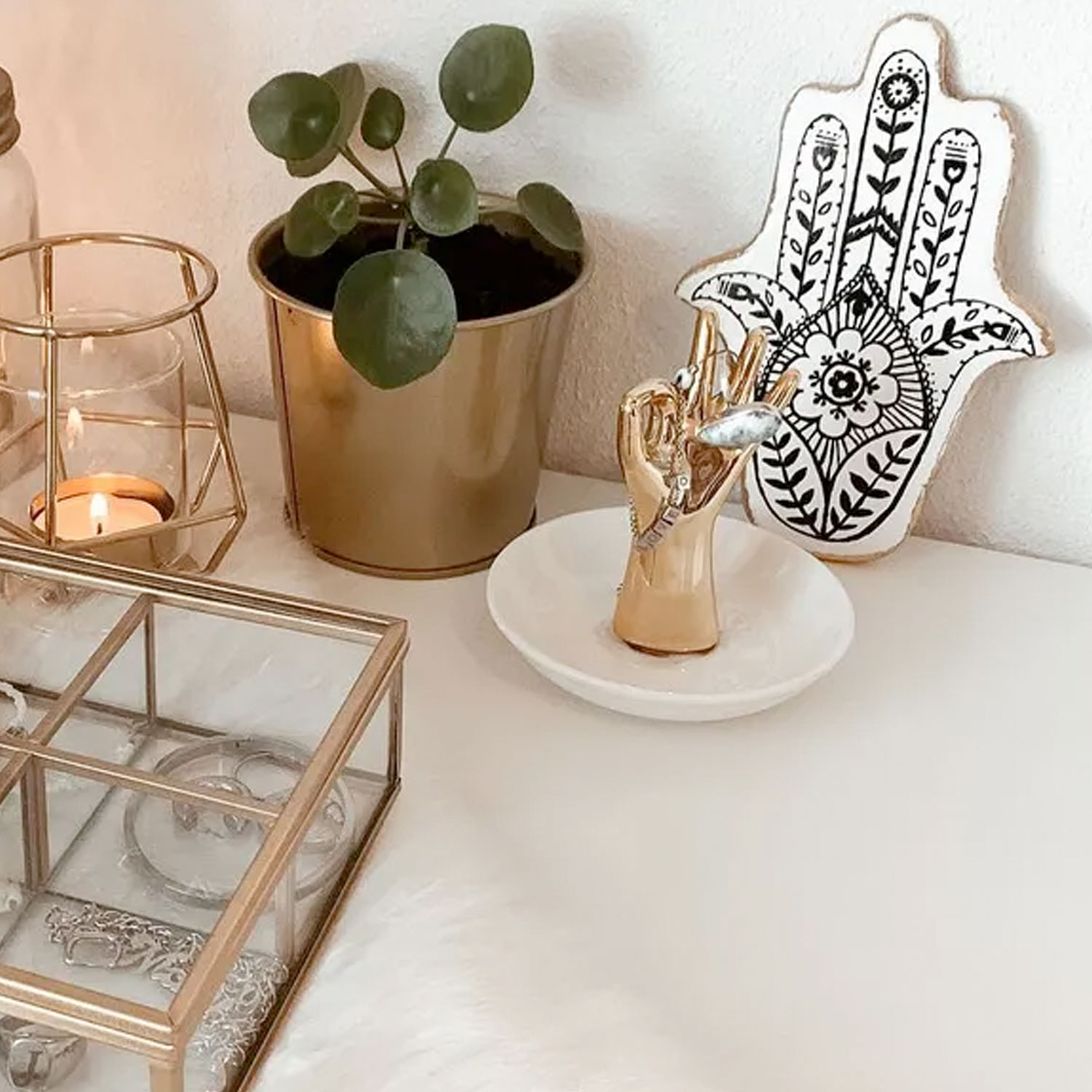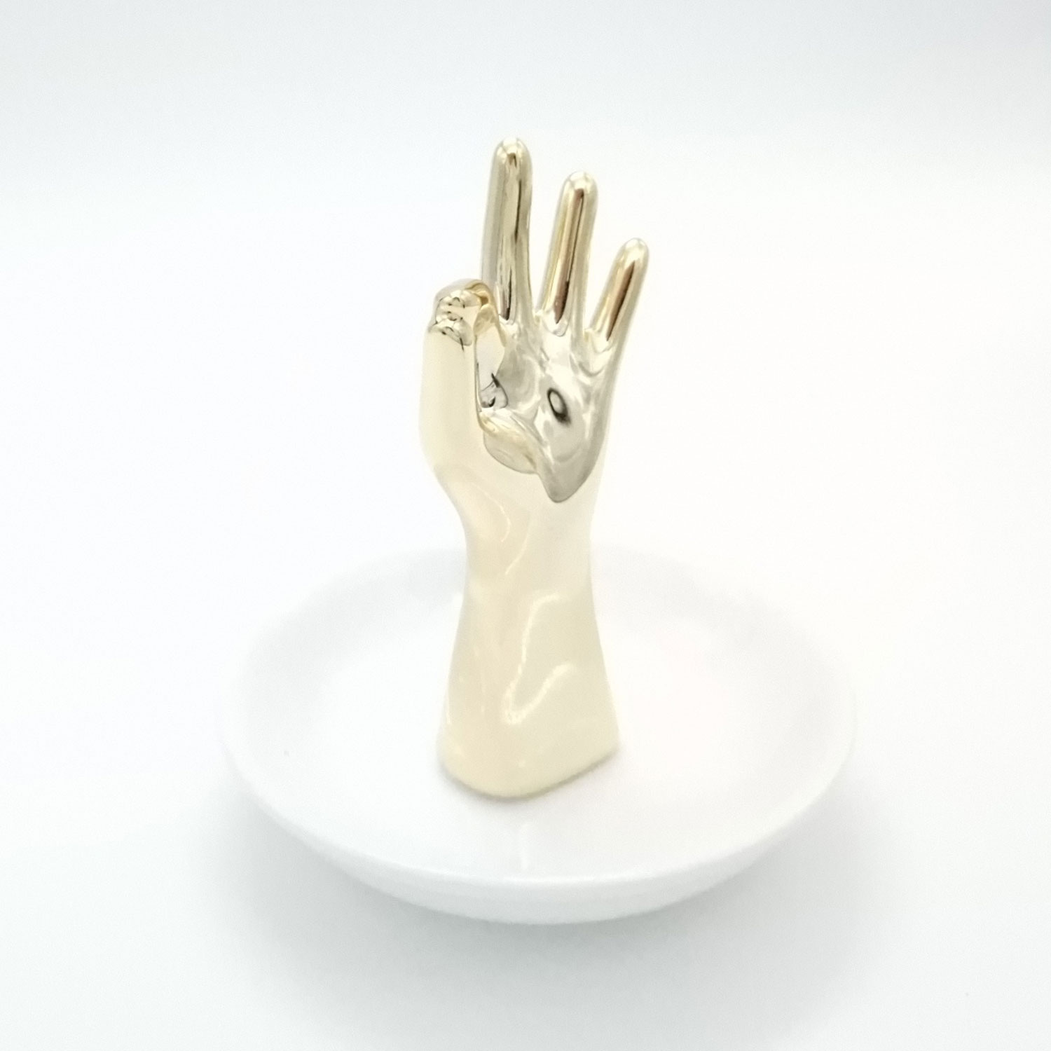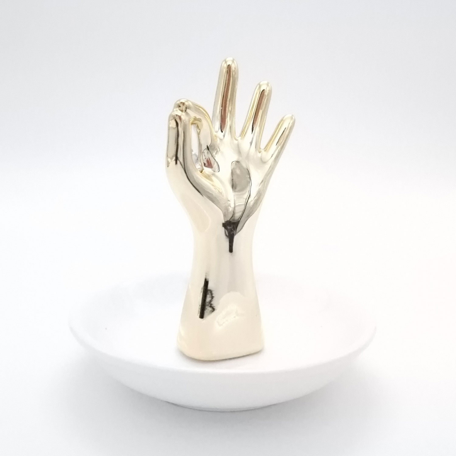 Toon je sieraden met elegantie op dit betoverende sieradenschaaltje. Met zijn speelse en tegelijkertijd praktische ontwerp is dit ronde schaaltje een absolute blikvanger voor je geliefde ringen, kettingen en armbanden. De centrale gouden hand biedt een perfecte plek om je sieraden keurig te ordenen na een dag vol glans en glamour. Vervaardigd uit duurzaam keramiek, heeft dit schaaltje een diameter van 10 cm en een hoogte van 10.5 cm. Het is niet alleen een handige toevoeging aan je sieradencollectie, maar ook een prachtig cadeau-idee!
