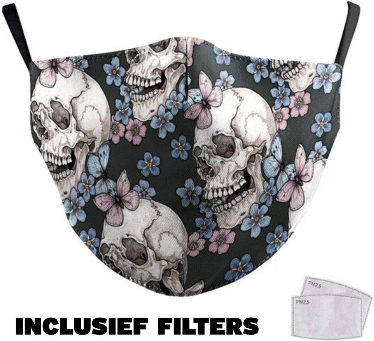 ➜ 1x Skulls printed mondmasker met 2 filters en verstelbare elastische koorden.