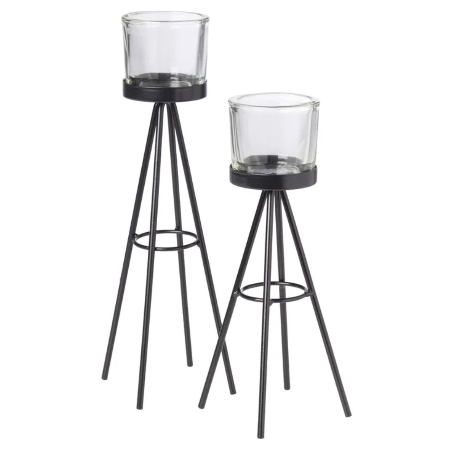 Geef je waxinelichtjes een verfijnd podium om op te schitteren met deze prachtige en stijlvolle waxinelichthouders met elegante pootjes. Deze unieke set bestaat uit twee verfijnde houders vervaardigd van stevig zwart metaal, elk met een verschillende hoogte (respectievelijk 24 en 28 cm), waardoor ze perfect bij elkaar passen en een charmant visueel contrast creëren.